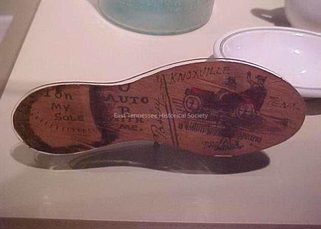 Postcard made of leather and in shape of shoe sole, obverse marked "Pon My Sole U Auto B WITH ME/ KNOXVILLE TENN.," "Tashey" handwritten in ink, with image of couple in red car, reverse marked "POST CARD/ Dr. A R Garrison/ Byinton/ Tenn," postmarked KNOX. 1/16/1906, 1 cent stamp, 6 3/4" x 2 1/4".Dimensions