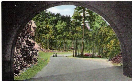 Postcard looking through tunnel with oncoming car in distance, marked "551 LOWER TUNNEL, THE GREAT SMOKY MOUNTAINS NATIONAL PARK," back caption reads "Modern highways are now built through the picturesque Smokies. This is the lower of two wide tunnels constructed to eliminate sharp turns in the roadway for safe motoring.," Thompsons, Knoxville, unused, c. 1940.Made/Created