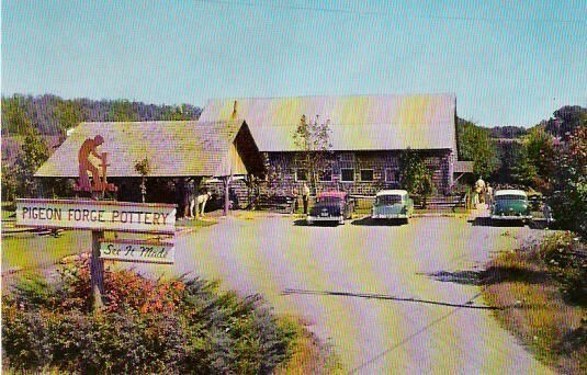 Postcard of the exterior of Pigeon Forge Pottery, back caption reads "Visitors from every state stop in to "See It Made" at the 100 year old tobacco barn converted into the famous pottery shop.," unused, c. 1950s.Made/Created