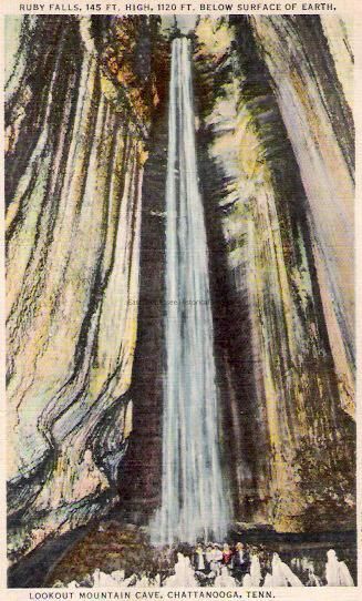 Postcard of waterfall in cave, marked "RUBY FALLS, 145 FT. BELOW SURFACE OF EARTH" and "LOOKOUT MOUNTAIN CAVE, CHATTANOOGA, TENN.," back caption reads "Ruby Falls is unique and different from any other cavern....," correspondence in pencil, 1936 postmark.Dimensions