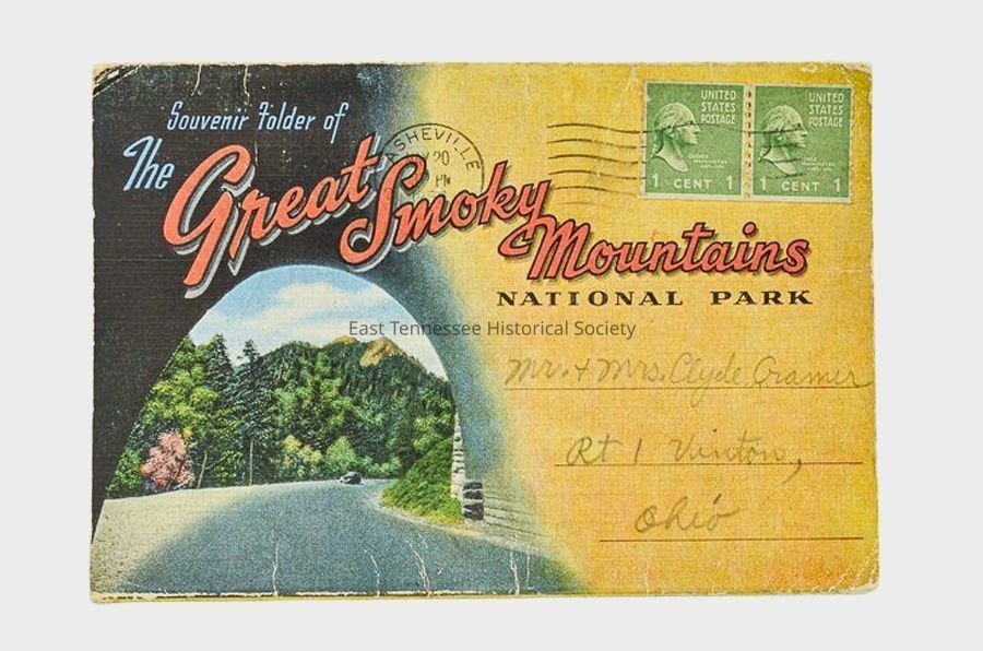 Postcard folder featuring Bruce Leslie in a grove of ferns. Les Williams, Bruce's nephew, shared that he was actually kneeling because Jim Thompson told him it would make the ferns look bigger. This photograph was colorized by one of the Wiley sisters, likely Eleanor since Catherine had passed away a few years before this would have been taken.Dimensions