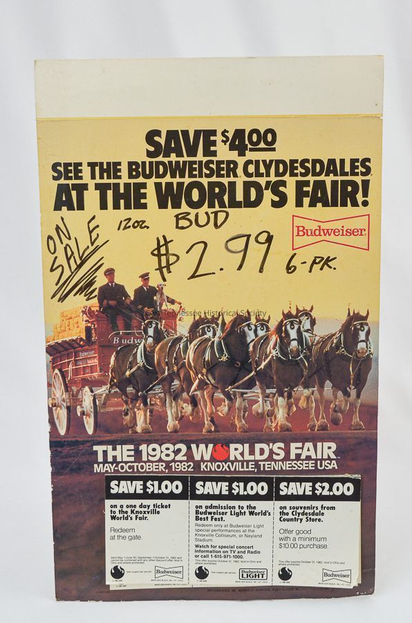 Poster, "Budweiser", "1982 Worlds Fair", "Knoxville, TN". Budweiser poster with coupons attached to the bottom. Image depicts horse carriage steered by 2 men in suits with a dog on a Budweiser wagon, pulled by horses. Reads: "Save $4.00 See the Budweiser Clydesdales at the Worlds Fair!"Dimensions