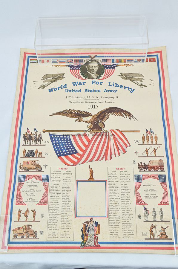 Military poster, white with red and blue stripes on edges. "World War for Liberty// United States Army// 117th Infantry, USA, Company B, Camp Sevier, Greenville, SC 1917." Has roster below a bald eagle carrying an American flag. Edges depicts sceneries the Army job categories- artillery, infantry, etc.Dimensions