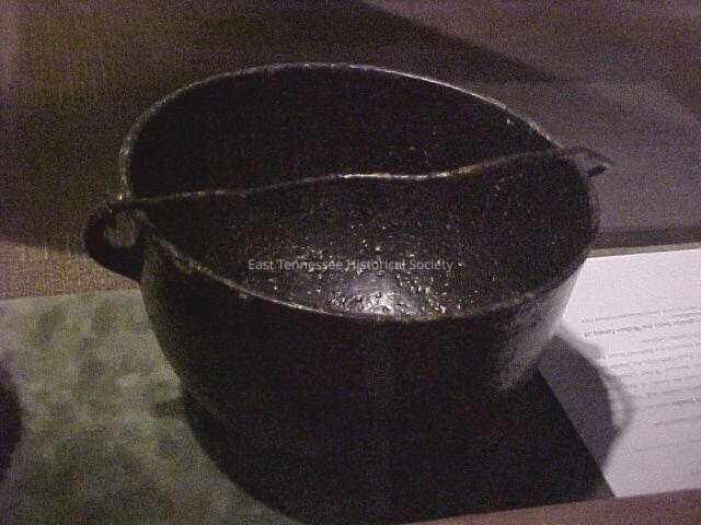 Iron pot (w/o lid) used in Cades Cove home of Andrew Jackson Shields and Vina Adeline Carrell Shields and later the family of their daughter Elizabeth Shields Chambers, black, early 1900s.