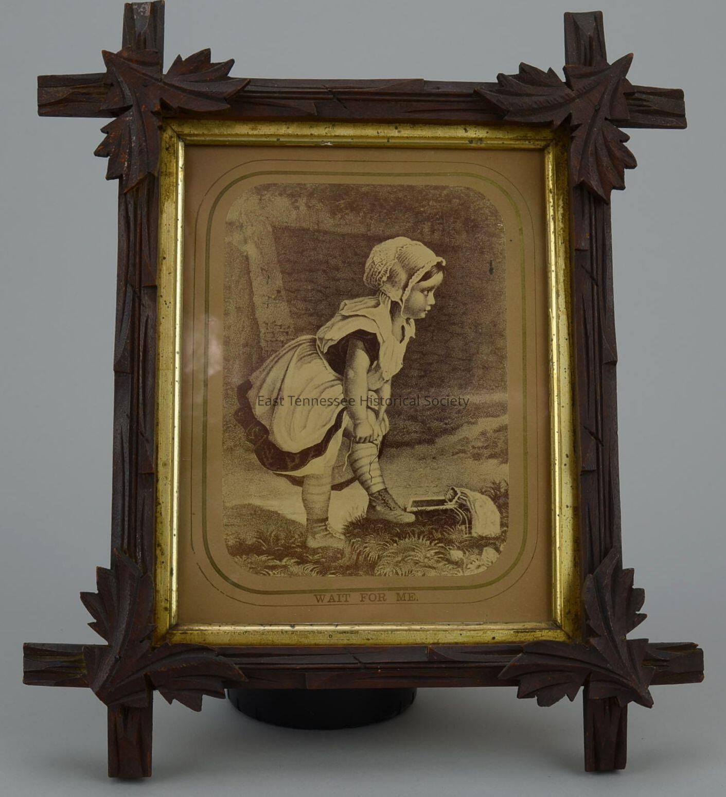 a) Print, sepia paper mounted on cardboard with title "Wait for Me" in gold at bottom front, shows right profile of young girl in bonnet/pinafore/high-button shoes in outdoor setting stopping to tie up her sack and looking forward, slate and cloth bag on ground by her left foot, stone wall in background, artist unknown, c. 1900.