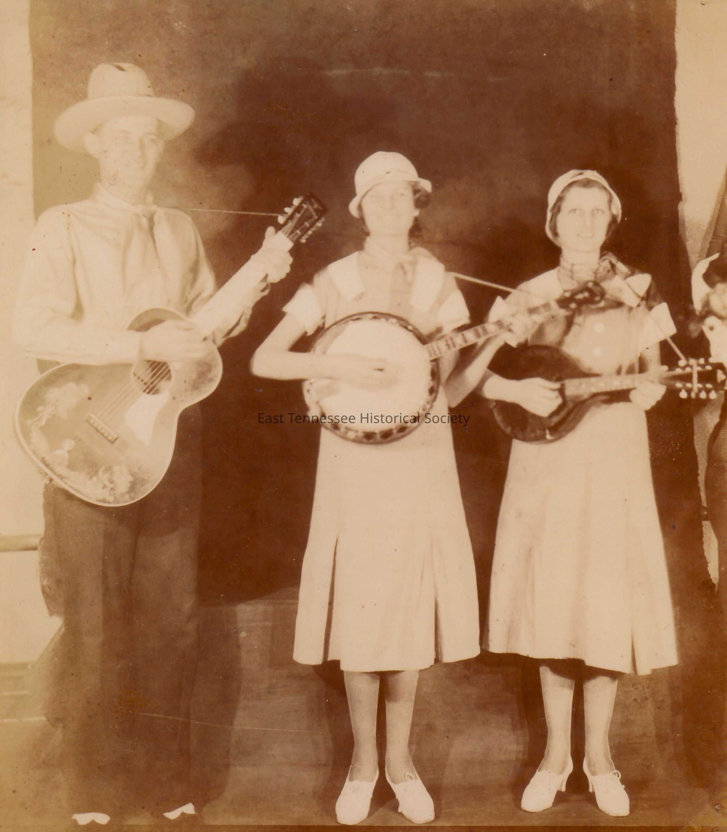 Photograph (copy print) of Blue Bird Ramblers performing on WNOX's "Mid-day Merry-Go-Round,"* left to right: Tom Ellison with daughters Ollie (on banjo) and Sue (on mandolin), 1939.