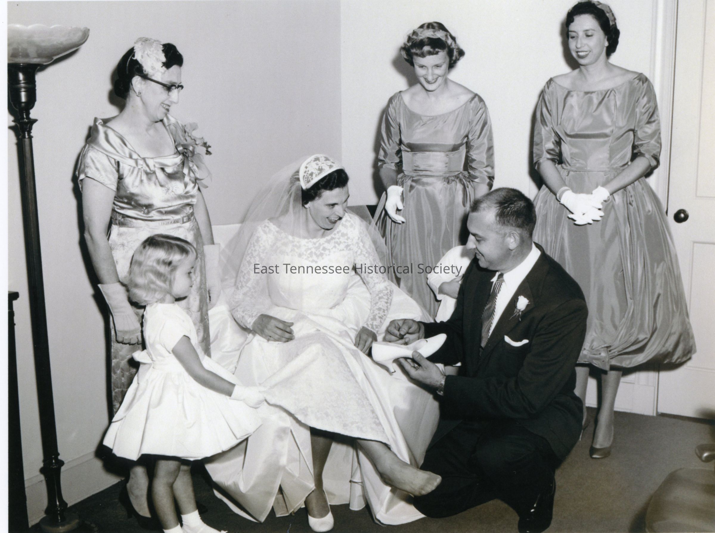 Black-and-white copy print of photograph from Elizabeth Luttrell Rochelle's wedding, showing her mother, Selma, in dress and hat 99.22.1-2, paper 8"h x 10 1/2"w, image 5"h x 6 1/2"w, 10/11/1958. Sister-in-law by marriage Margaret Briscoe "Peggy" Rochelle stands (w/right hand out) to Elizabeth's right.Made/Created