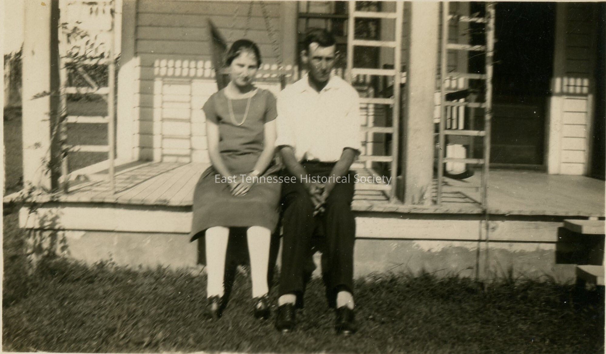 Black-and-white photograph of Charlie Britton and wife Nannie Lee, shows dark-haired man and woman sitting on porch edge of frame house, 2 3/4"h x 4 1/4"w. Woman wears medium-color short-sleeve dress with strand of beads, light stockings, and lace-up dark shoes. Man in light long-sleeve shirt with sleeves rolled up, dark slacks, light socks, and lace-up shoes. Both have hands folded in their laps. Ladder-like trellis on each side with foliage growing up; porch swing behind them. Reverse marked "Nannie Lee Jones Britton, Charlie Britton." c. 1920Made/Created