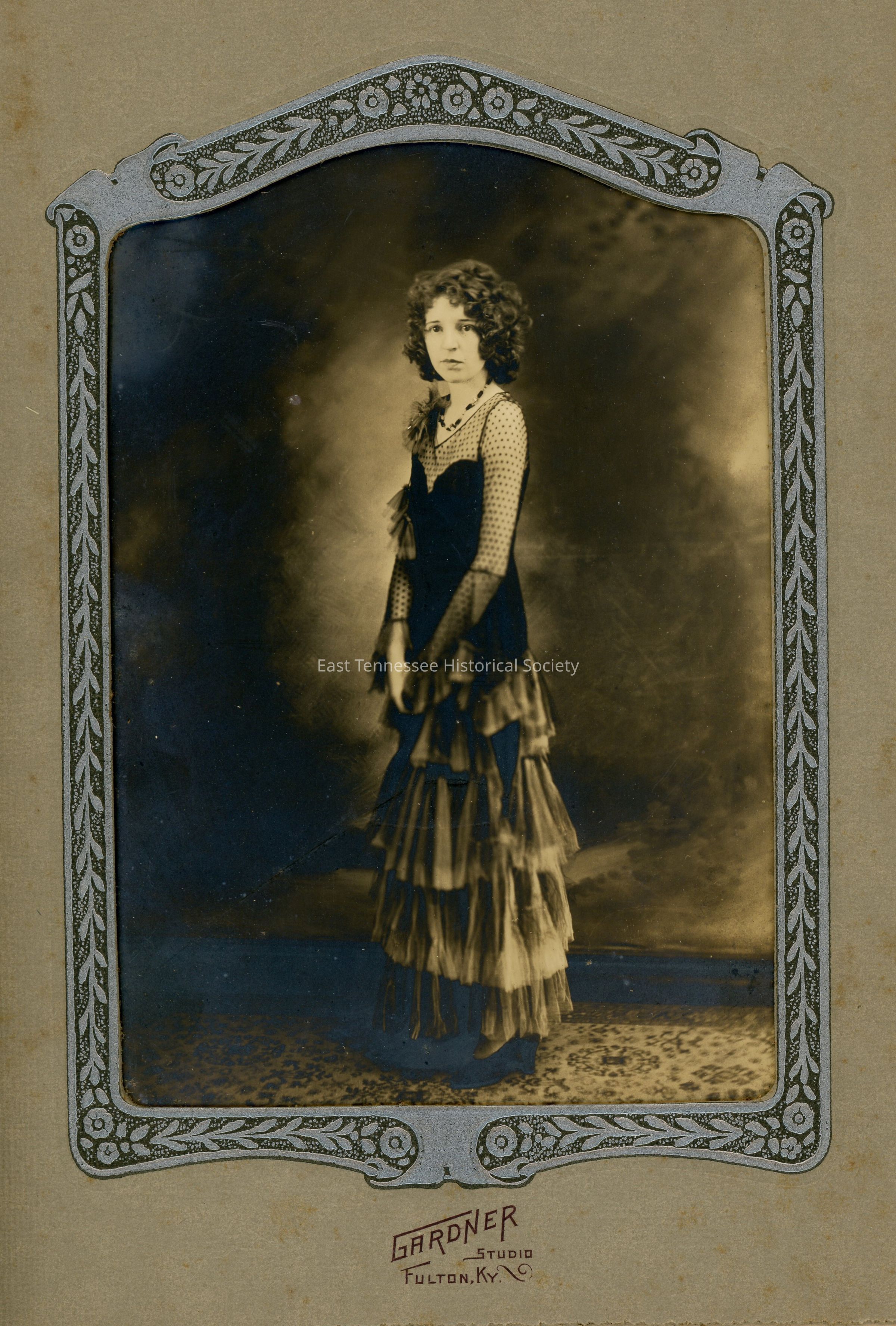 Studio photograph of Faye Lewis [Miles] mounted in vertical folder, three-quater view of woman standing and looking to camera's left, shoulder length dark hair, fancy floor-length dress with tiered layers to skirt, appears to be wearing coursage at proper right shoulder, fancy silver detailing around image, bottom center marked "GARDNER / STUDIO / FULTON, KY.," folder 9 1/2"h x 6 3/4"w, c. 1925.Made/Created