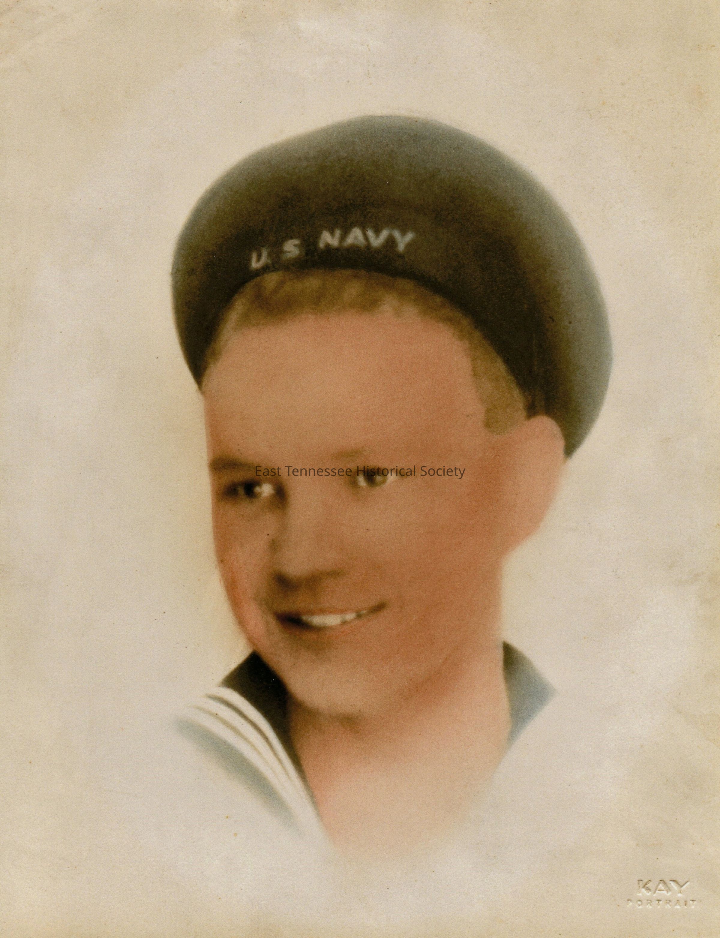 Color photograh (copy print) of Lloyd Elbert Lunsford in Navy uniform with dark cap marked "U.S. NAVY," neck up and looking to side of camera, bottom right corner marked "KAY / PORTRAIT," 7"h x 5 1/2"w, c. 1943.Made/Created