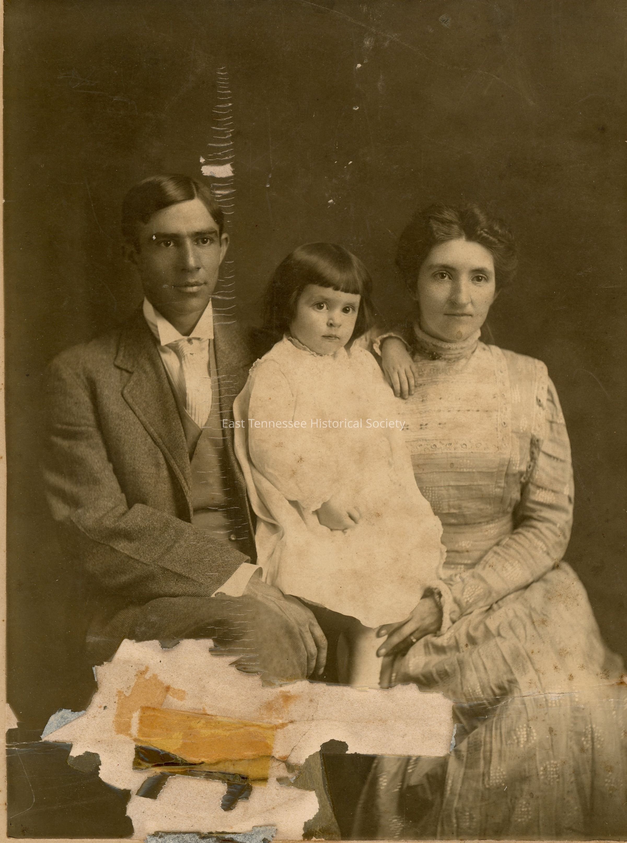 Studio photograph of Tolbert Alvin Lewis, daughter Faye and wife Lena Elliott, adults sit/child stands, man wears dark suit/vest with white shirt and tie, girl in white long-sleeve dress/hair in bangs/left hand placed on woman's right shoulder, woman in white long-sleeve dress/left hand (showing wedding band, ring) on child's leg, image 8 1/4"h x 6 1/8"w, 10"h x 8"w overall, 1909-1910.Made/Created