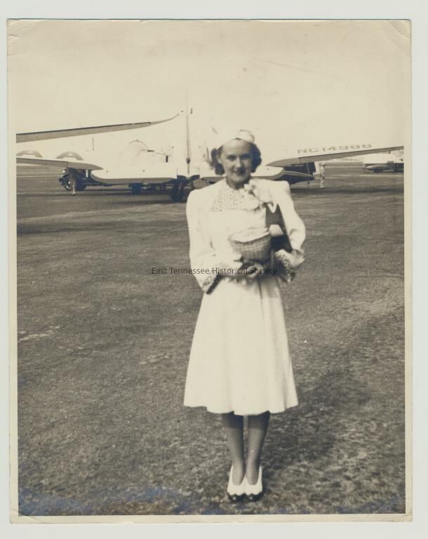 Digital photograph of Esther Carlson on tarmac out of uniform with airplane behind, 1939-1940.