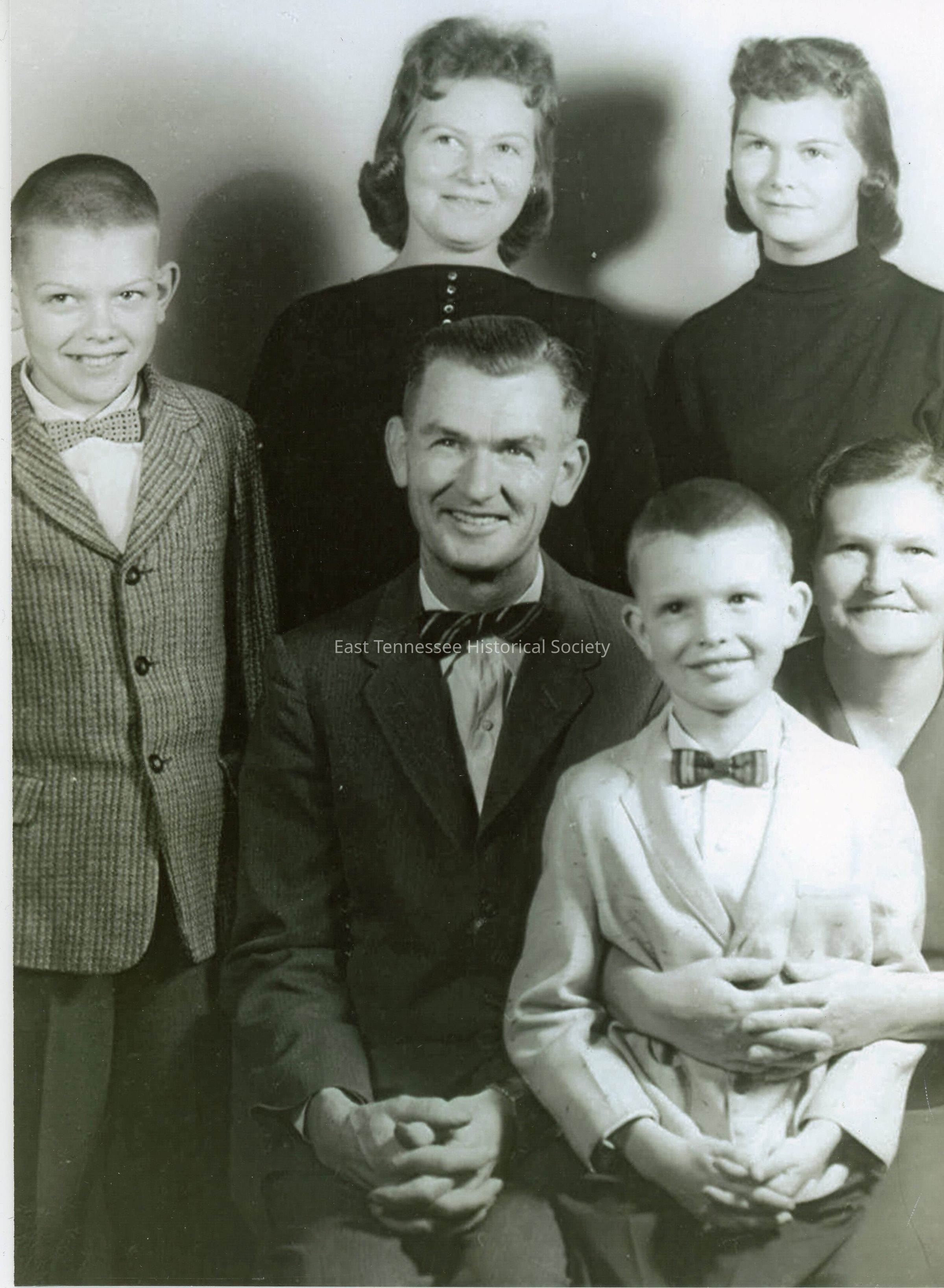 Black-and-white copy print of Terrell family photograph, seated husband and wife, who has arms around youngest son (Earl), older son to left of his father, two daughters (older than the boys) stand behind parents, males in sport jackets and bow ties, females in solid-color dresses, 7"h x 5"w, c. 1959.