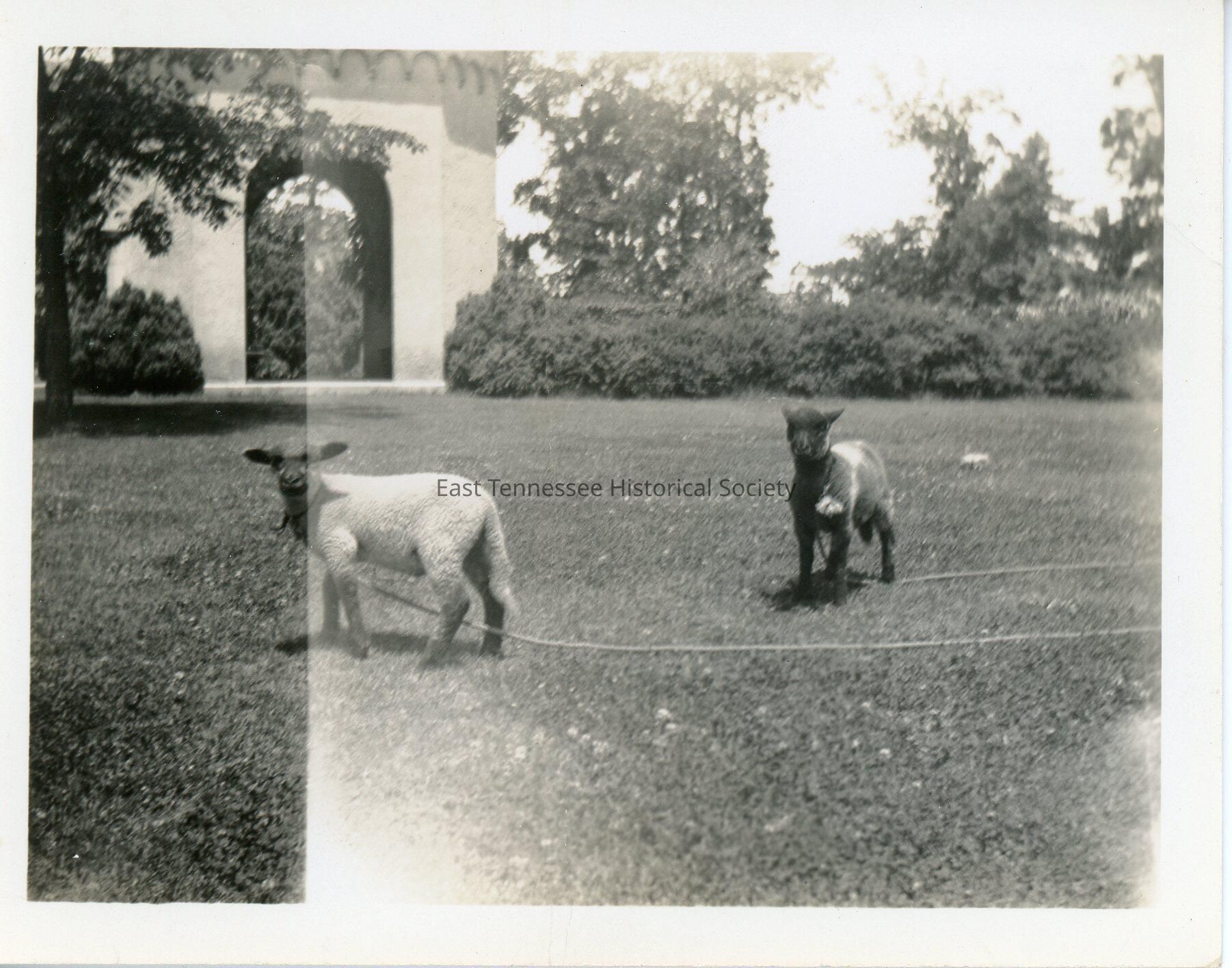 Black-and-white photograph of Bob* & Boo (lambs) at Westcliff (home of Weston Fulton family), c. 1928.