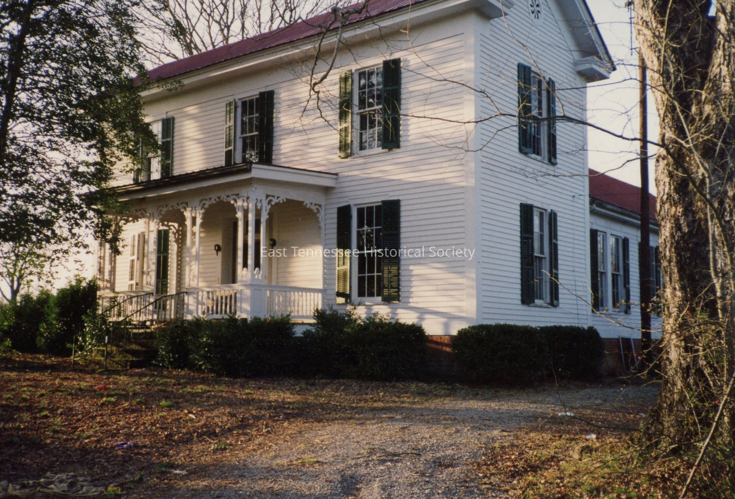 Color photograph of Browder home (Sweetwater), three-quarter view of two story white-frame structure with front porch and additon at back, dark shutters at windows (3 above 2), gravel drive at bottom right, 4"h x 5 7/8"w, post 1966.Made/Created