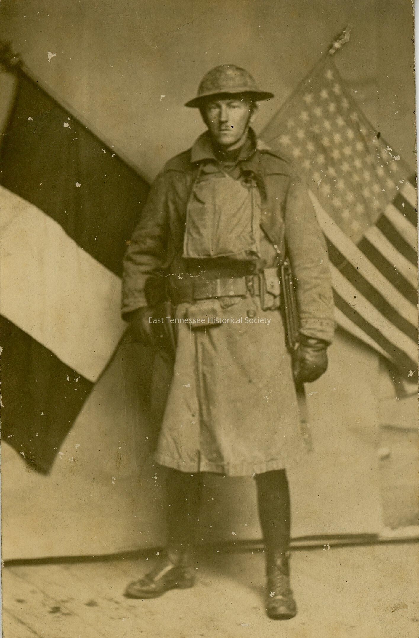 Photograph (b&w) of Howard H. Wilson in WWI uniform, French and American flags in the background, photograph was taken in France, 3 1/2" x 5 1/2", 1916-1918.Collection