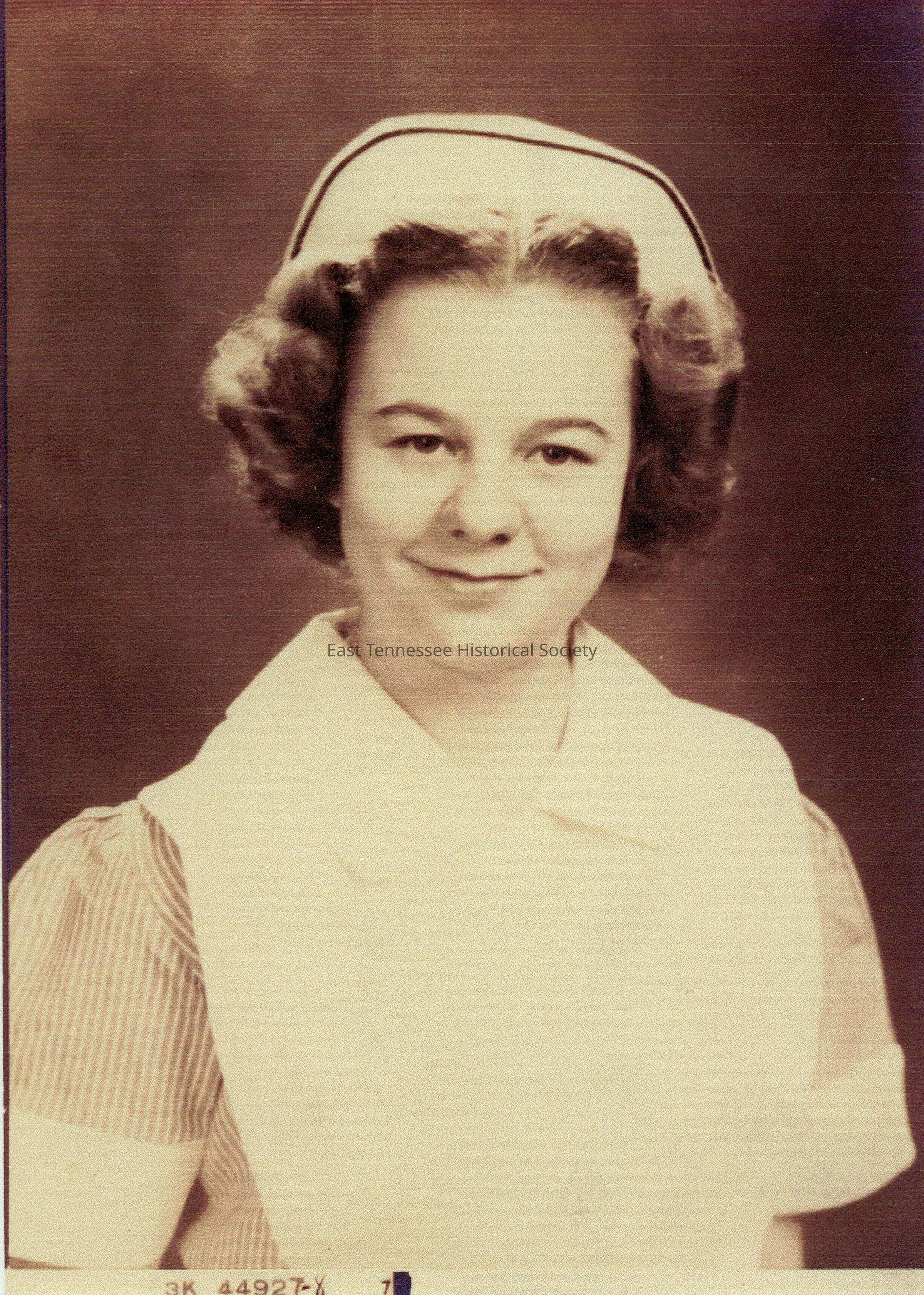 Copy print of Mary Madge Lawson in Knoxville General Hospital as a student in nurse uniform, 7"h x 5"w image area, c. 1947.