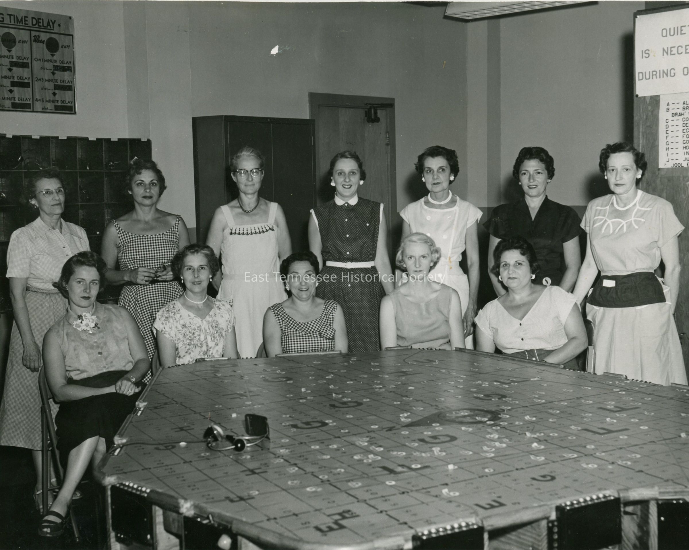 Black-and-white photograph of 12 Knoxville-area women participating in U.S. Air Force Ground Observer Corps (GOC), back stamped "OFFICIAL USAF PHOTO" and written in pencil is "FILTER CENTER/ c. 1946-1950/ JESSE JOHNSON/ MARY ROCHELLE." (Johnson is second from right on front row and Rochelle is third from right on back row.)Dimensions