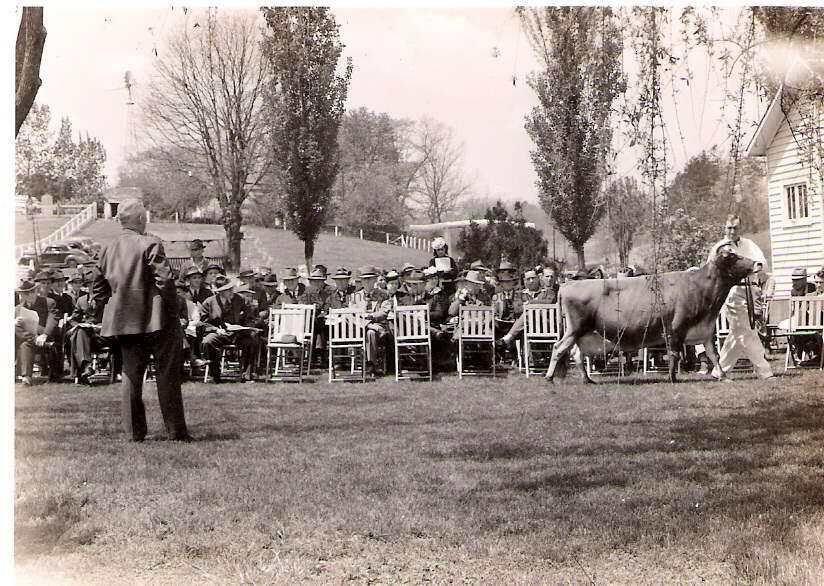 Black-and-white photograph of Tennessee Jersey Breeders event at Indian Summer Jersey Farm, late 1930s-early 1940s.