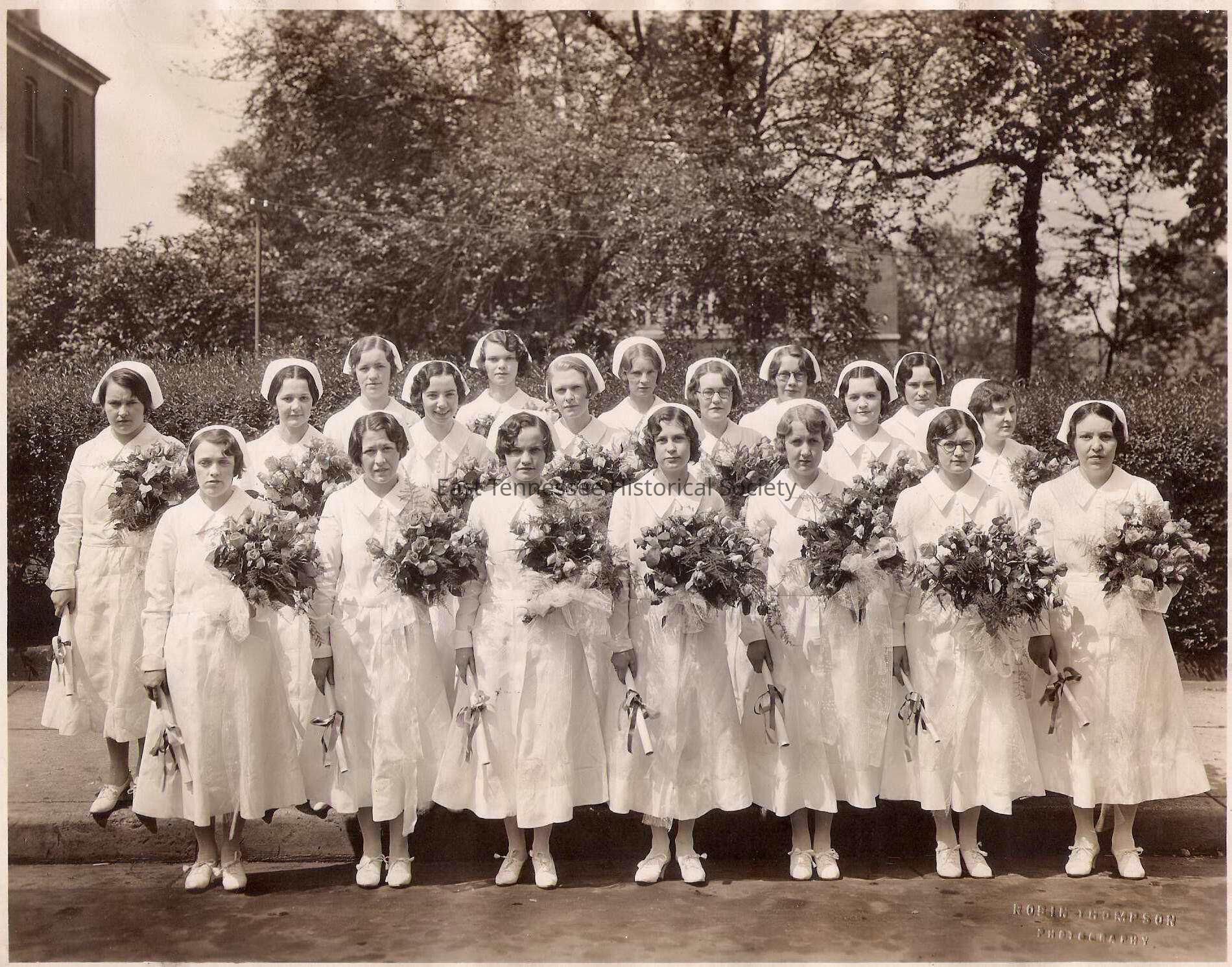 Black-and-white photograph of the 1931 graduating nursing class of Knoxville General Hospital, shows group of young women positioned out-of-doors in three rows and wearing white uniform dresses, caps and shoes and holding diplomas in right hand and bouquets of roses in their left, embossed "ROBIN THOMPSON/ PHOTOGRAPHY" in the bottom right corner, 7 3/4" x 9 3/4". Lorene Parker is third from the left, front row.Made/Created