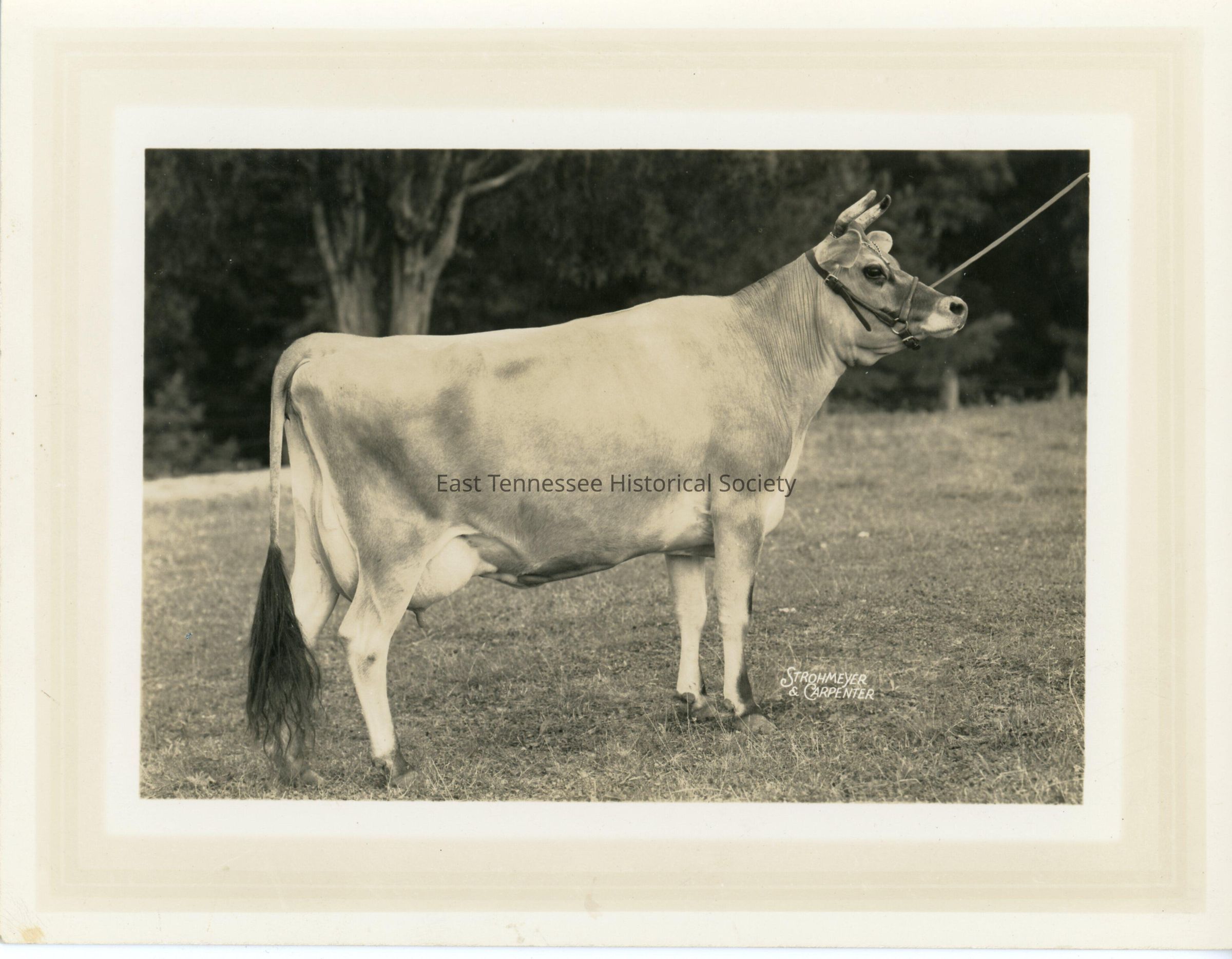 Black-and-white photo of Jersey dairy cow at Indian Summer Jersey Farm, side-view of cow standing in field with halter on, "Strohmeyer/ & Carpenter" printed in white to right of cow's front feet, reverse has "Emperor's Peggy Helen 1221894" written in pen in top left corner as well as negative number 71934 and "STROHMEYER & CARPENTER/ Incorporated/ Photographers of Animals/ P.O. Box 788 White Plains, N.Y.," lae 1930s-early 1940s.Made/Created