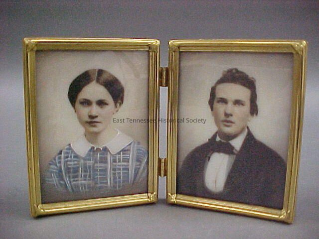 Bi-fold frame with two photographs on interior, double gold frame connected by 2 hinges, fleur-de-lis shape detailing in the corners of the frames, floral design that runs along the outer edges of the frames, the two pictures are of a woman and a man, the woman has brown middle-parted hair pulled back, blue eyes, no expression, white collar and a blue and white plaid dress, the man has curly brown hair, blue eyes, no expression, black suit and bowtie with a white undershirt, the back of the frames is felt to hold the pictures in place. Height- 4 1/2 in. Width- 7 in. Depth- 1/2 in.