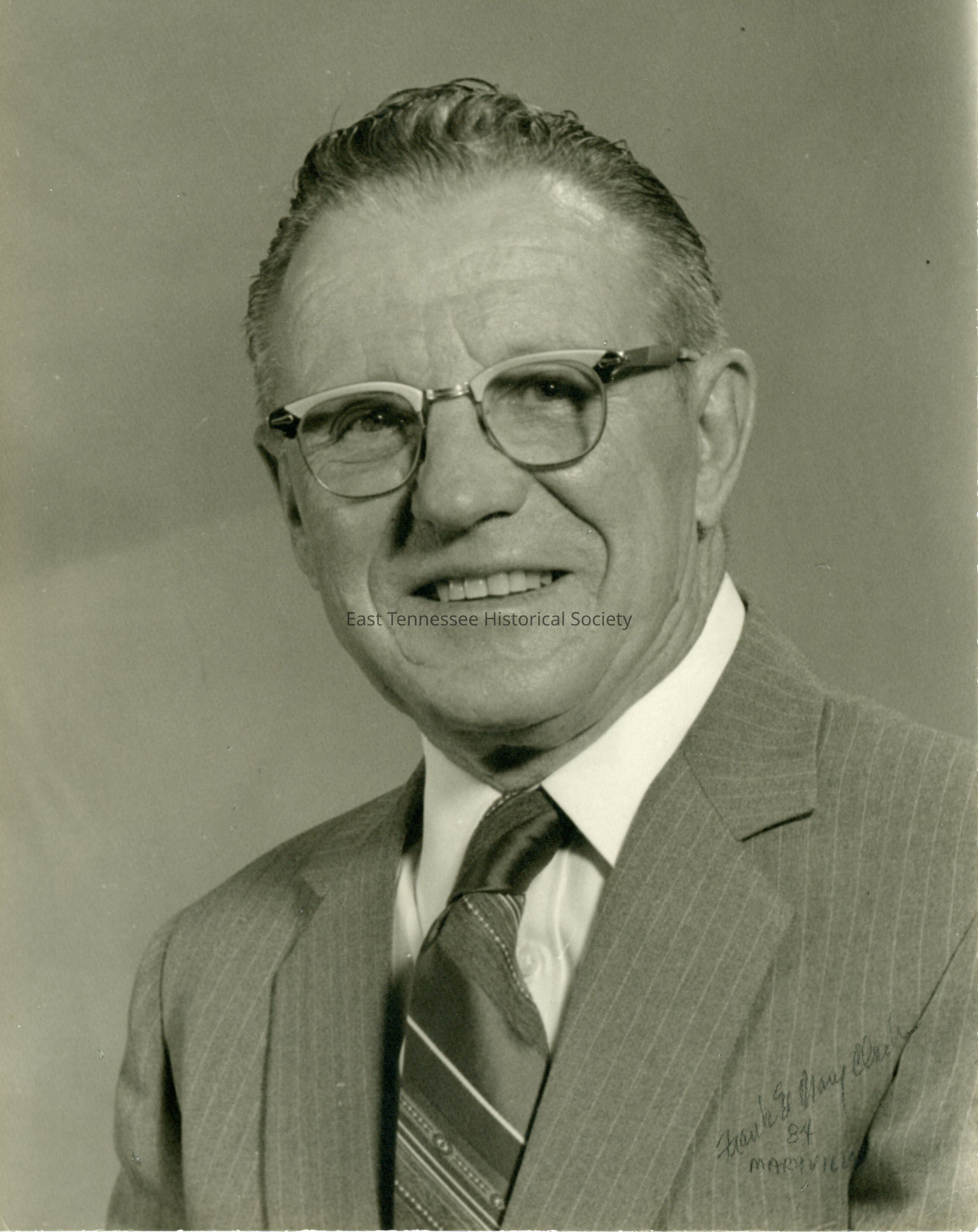 Studio photograph (original) of Bernard Frye, black-and-white bust portrait of man in striped suit and tie wearing glasses, marked "Frank & Mary Clark/ 84/ MARYVILLE" written on lower right front corner, "Bernard Frye/ November 1984" handwritten on reverse with stamped "Frank & Mary Clark/ PHOTOGRAPHY/ MARYVILLE, TENN.," 9 3/4"h x 7 3/4"w, 1984.Dimensions