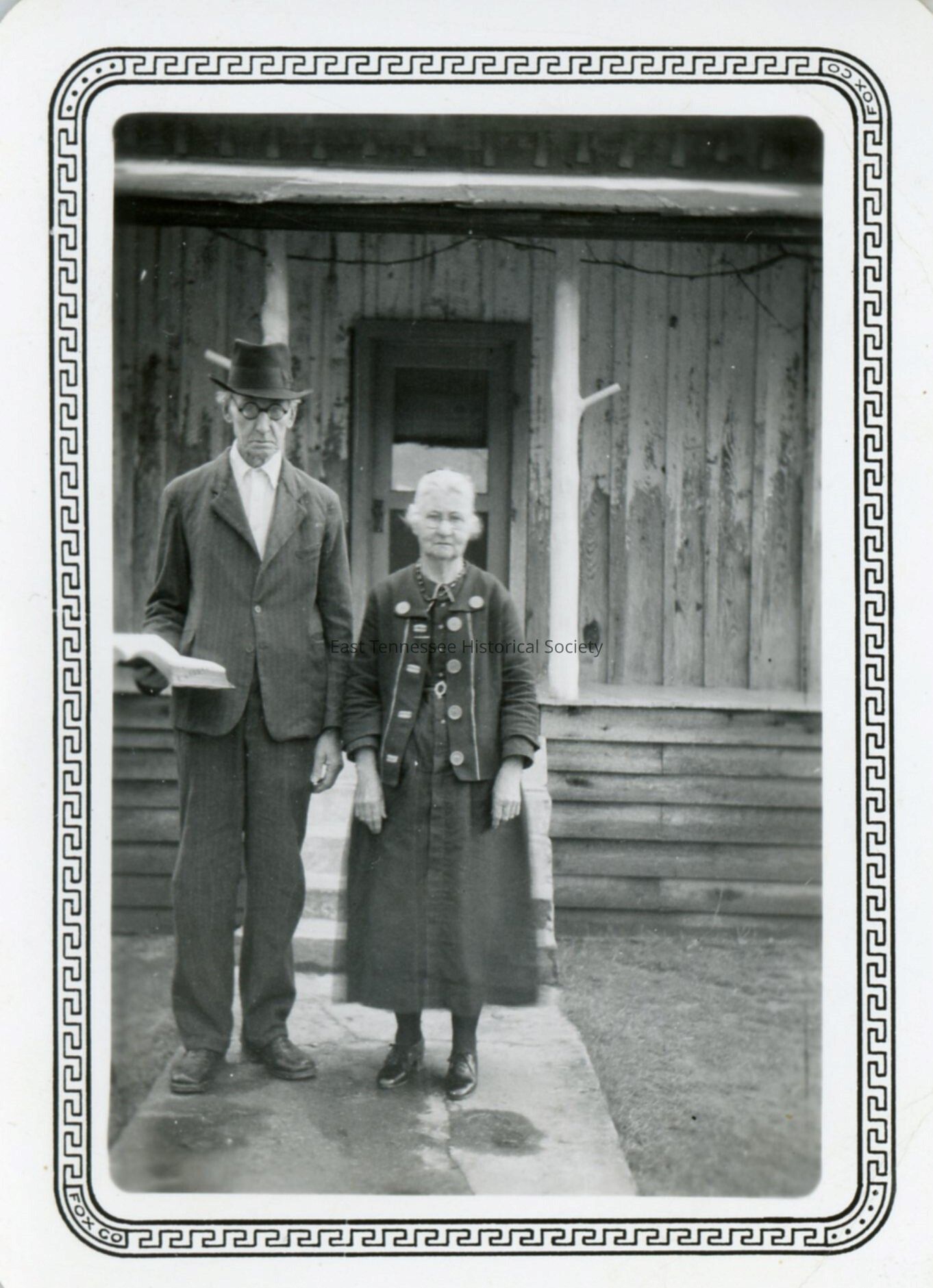Photographic print (original), black and white, shows Frank and Cornelia Edwards in dress clothing standing on sidewalk in front of unidentified building, on reverse "Grammie and Grandan sp?)/ Mr. & Mrs. W. F. Edwards" handwritten in pencil at top with "Grandma &/ Grandpa Edwards" written in pen at the center, "at Home (?)" in pencil at right and "1939" in pencil at bottom right, stamped Fox Co. logo/ 1941" along left edge, 4"h x 3"w, 1939.Dimensions
