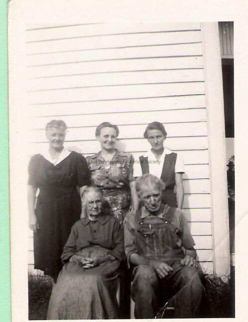 Photographic print (original), black and white, shows Cornelia and Frank Edwards seated with three (of four) daughters standing behind--Viola (left), Annie (Mrs. Dave Lester, middle), and Louverne (Mrs. G. W. Shoffner, right). [Bessie not included], handwritten in blue pen on reverse: "Mr. & Mrs. W. F. Edwards/ Mother/ Mrs. Dave Lester/ Mrs. G. W. Shoffner/ Above our house," 3 1/2"h x 2 1/2"w, c. 1939.Dimensions
