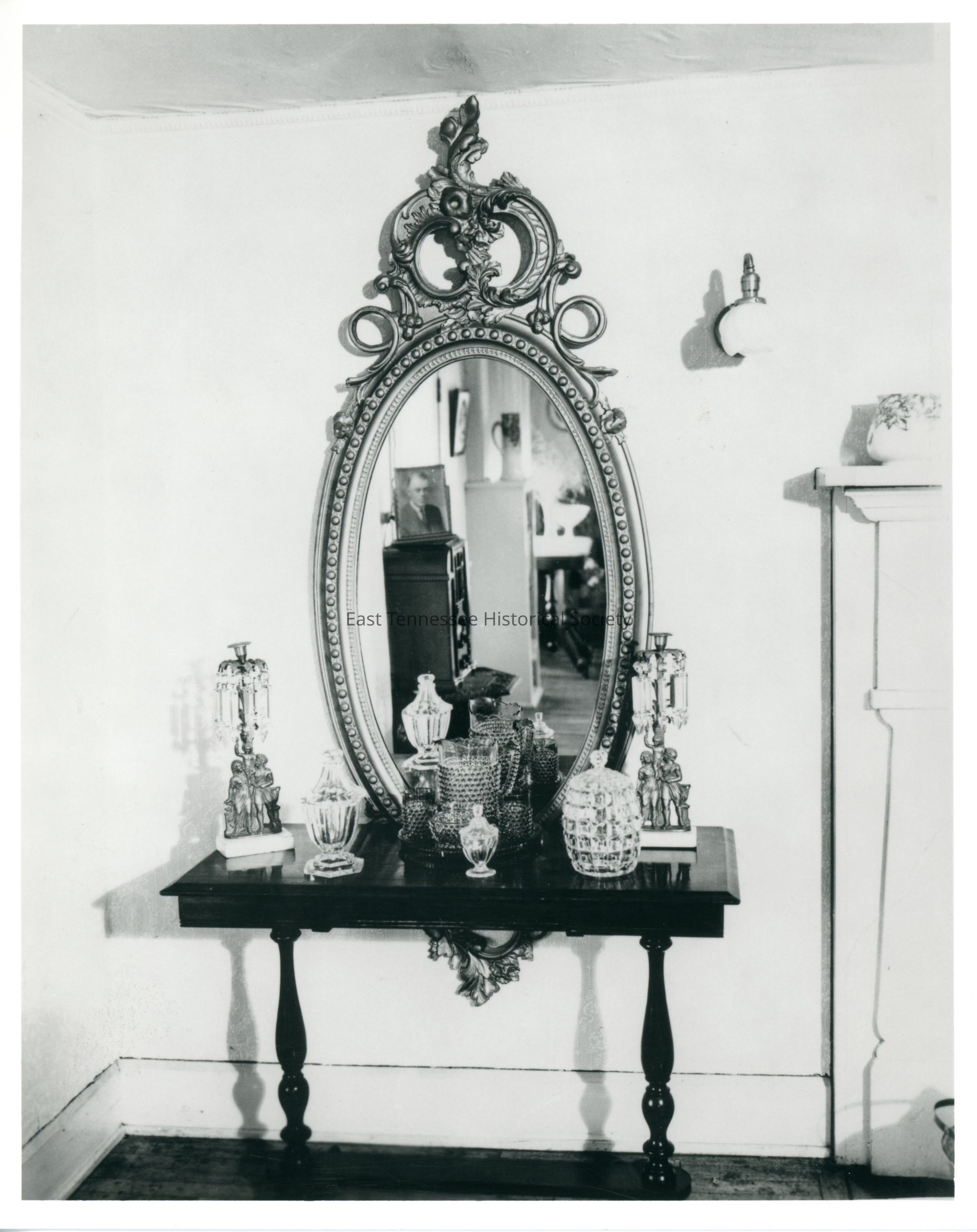 Copy print of c. 1930 black-and-white photograph taken in the living room of Jessie and John Clark's "Oakcrest"* home in Maryville, shows assorted glass items on a table and ceramics on the mantel and reflected in the mirror hanging on the wall, 10"l x 8"w. Information on reverse handwritten in ink by donor: "Labeled by Jessie Cates Clark/ 'Mrs. John M. Clark/ Oakcrest Rt 3/ Maryville, Tennessee/ A corner of my Oakcrest Home'/ Note by B.C. Clark Jr./ Picture during period early 1930s-1945. Mrs. Clark died Sept. 1946"