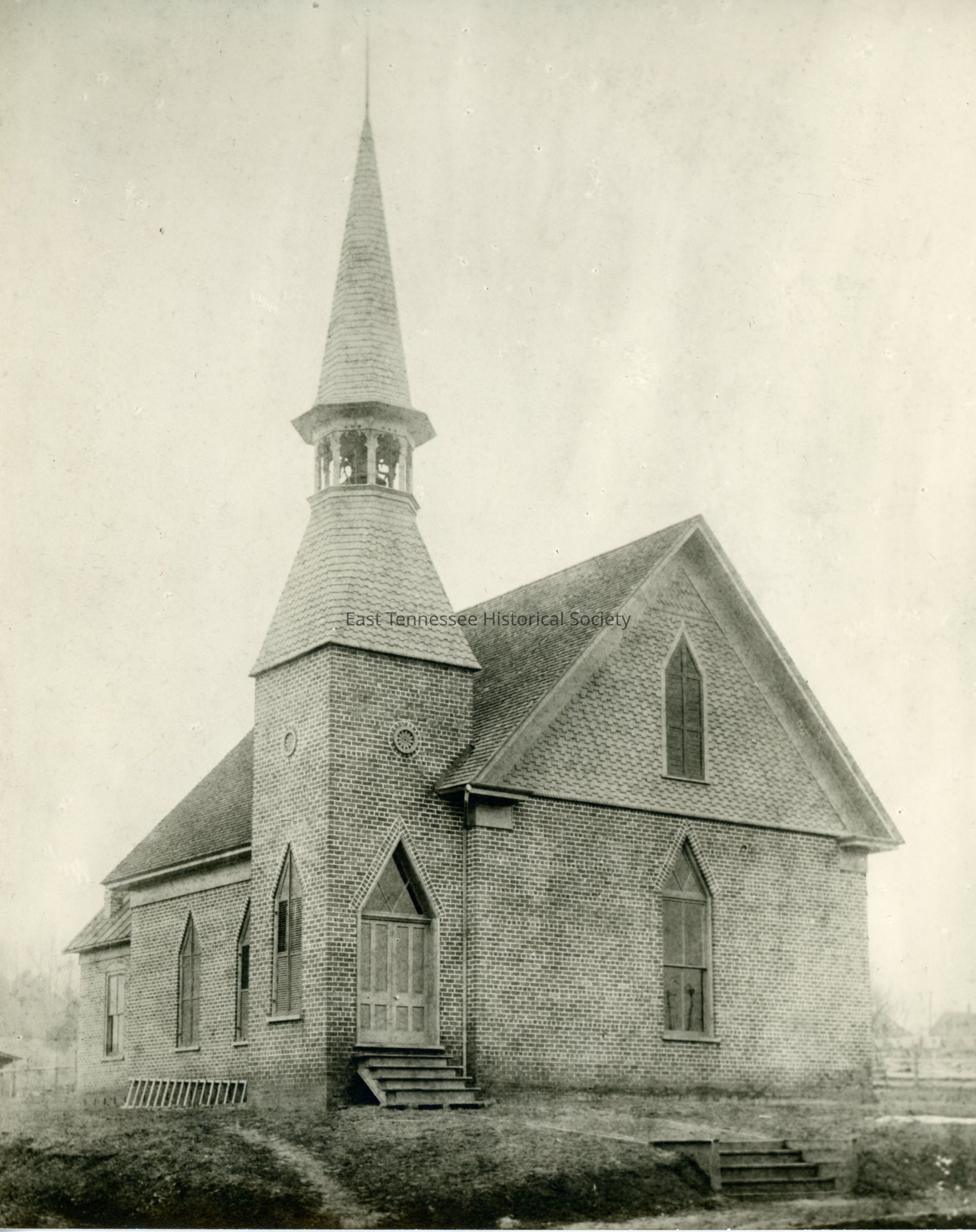 Black-and-white photograph of First Baptist Church of White Pine, brick exterior with steeple/entrance door at viewer's left side, "First Baptist Church/ White Pine (1911)" handwritten in blue pen/pencil on reverse, 10"h x 8"w, 1911.Made/Created