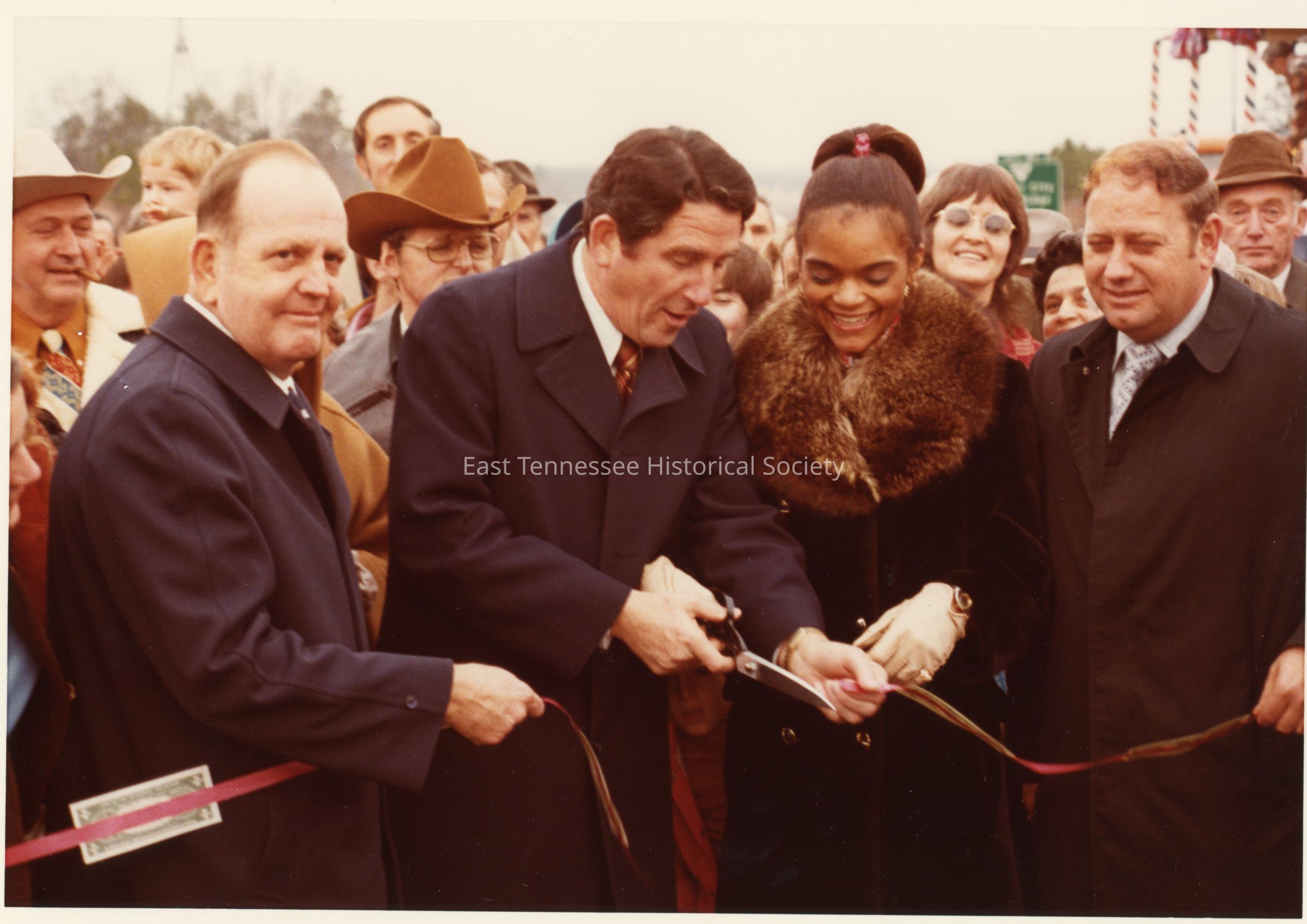 Color photograph of East Tennessee Interstate highway (I-40, 75, 81) opening ceremony, Tennessee governor Winfield Dunn cuts ribbon at center, Tenn. Dept. of Transportation commissioner Robert F. "Bob" Smith to his left, unidentified woman to Dunn's right, $1 bill taped to ribbon, E.T. location unknown, 12/20/1974.