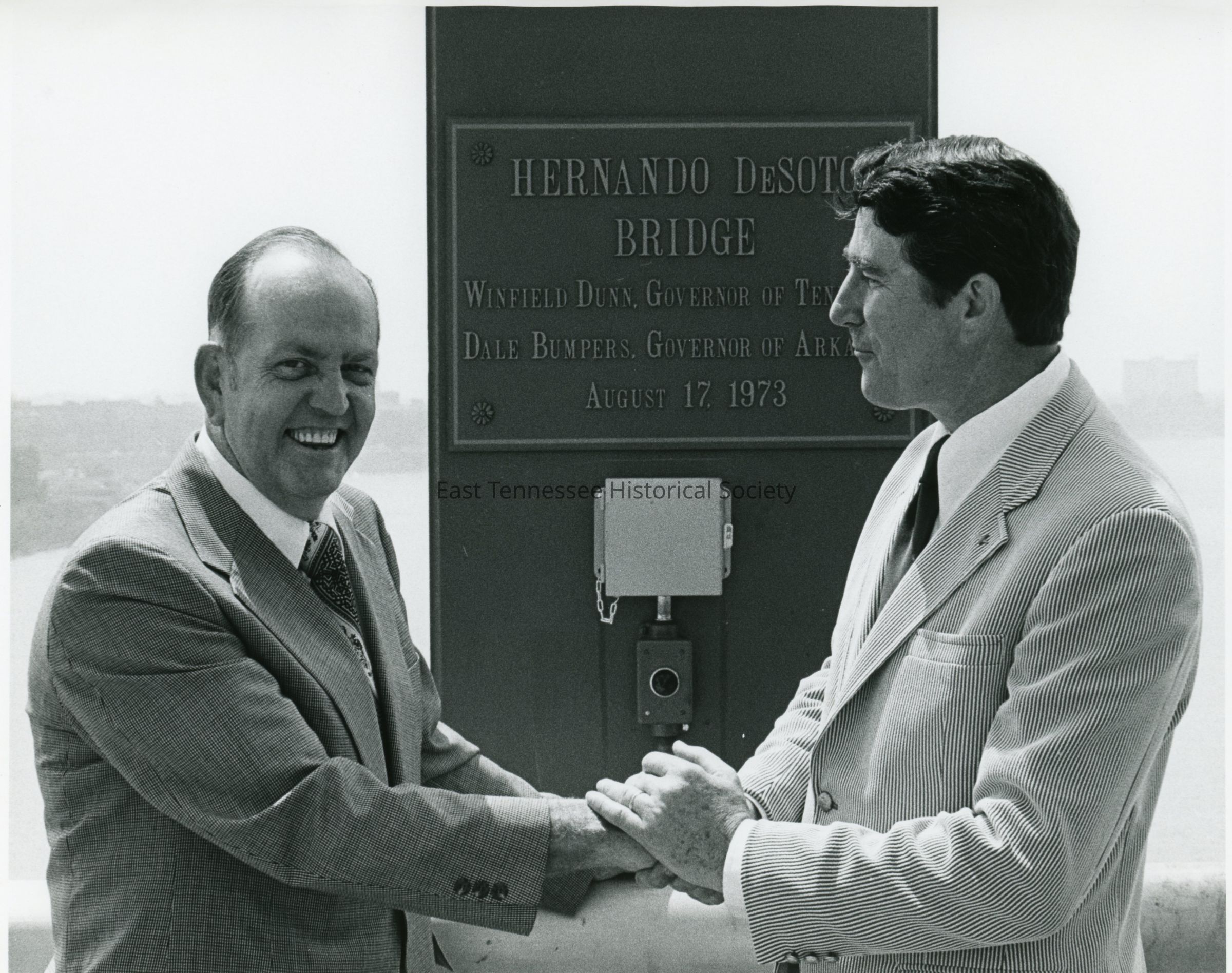Black-and-white photograph of Tennessee governor Winfield Dunn at right and Tennessee Dept. of Transportation commissioner Robert F. "Bob" Smith in front of plaque reading "HERNANDO DeSOTO/ BRIDGE/ WINFIELD DUNN, GOVERNOR OF TENNESSEE/ DALE BUMPERS, GOVERNOR OF ARKANSAS/ AUGUST 17, 1973," 8"h x 10"w, 8/17/1973.