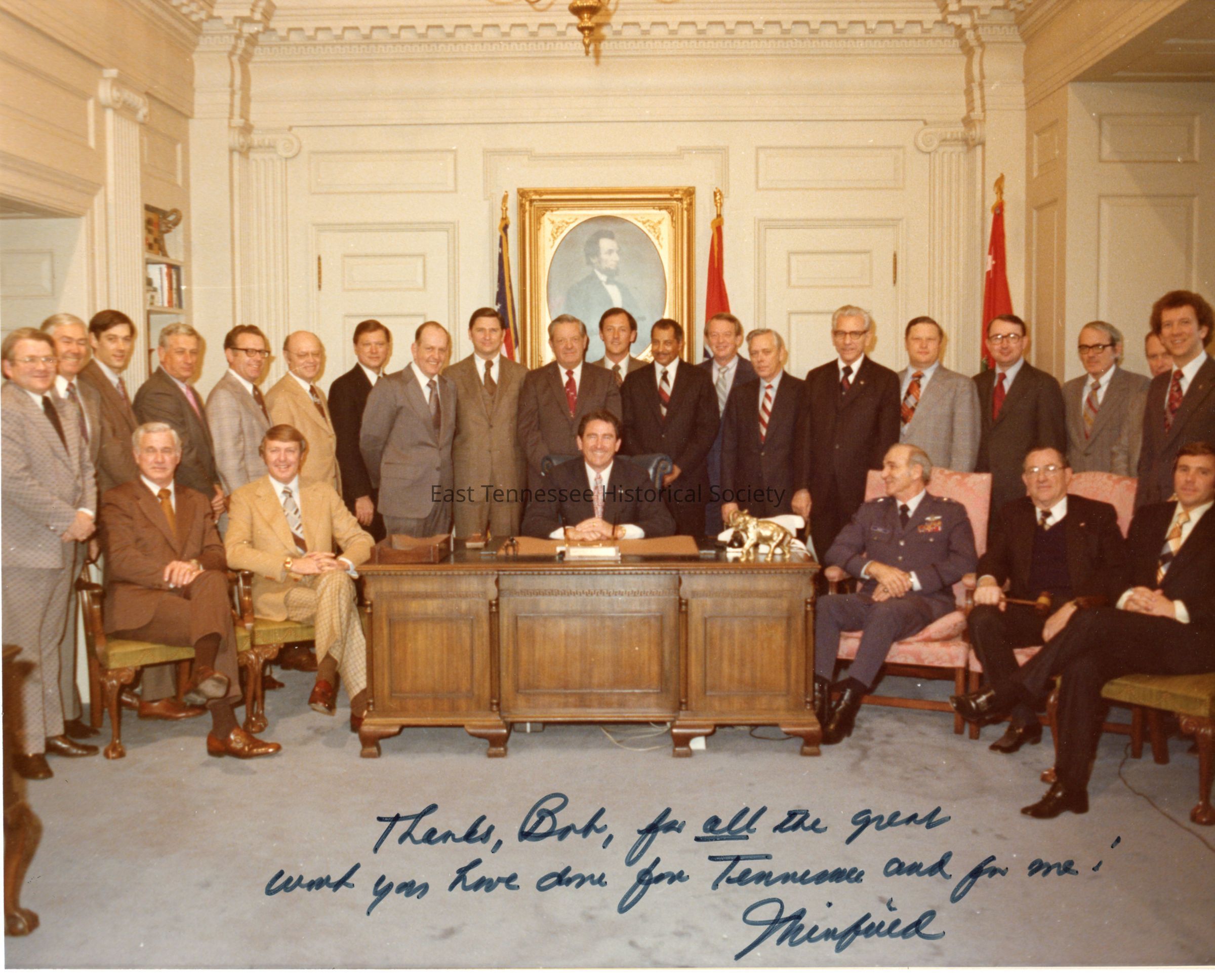 Color photograph of Governor Winfield Dunn's staff, "Thanks, Bob, for all the great/ work you have done for Tennessee and for me!/ Winfield" handwritten in black ink at bottom front edge, Dept. of Transportation commissioner Robert F. "Bob" Smith (in gray suit and tie) stands three people to left of Dunn, [Republican] elephant figurine on Dunn's desk, Abraham Lincoln portrait in background, 8"h x 10"w, 1974.Made/Created