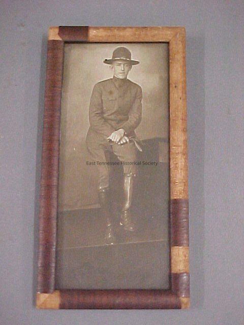 Framed photograph of a unidentified calvary soldier from WWI, black and white photograph, the man has on a flat billed hat, army uniform with buttons down the front, his arms are crossed in his lap with gloves being held in his proper right hand, he is half sitting/half standing on a desk or table, has on laced up boots with shin protectors on, there is a piece of glass over the photo, it is in a wooden frame, the back of the frame has two hooks with wire for hanging, there is a deteriorating piece of paper that has "John/ Hayns/ My Uncle" written in cursive on it in pencil, under the piece of paper there is cardboard and metal prongs to hold the cardboard in place. Height- 8 3/4 in. Width- 4 3/8 in. Depth- 1/2 in. WWI era