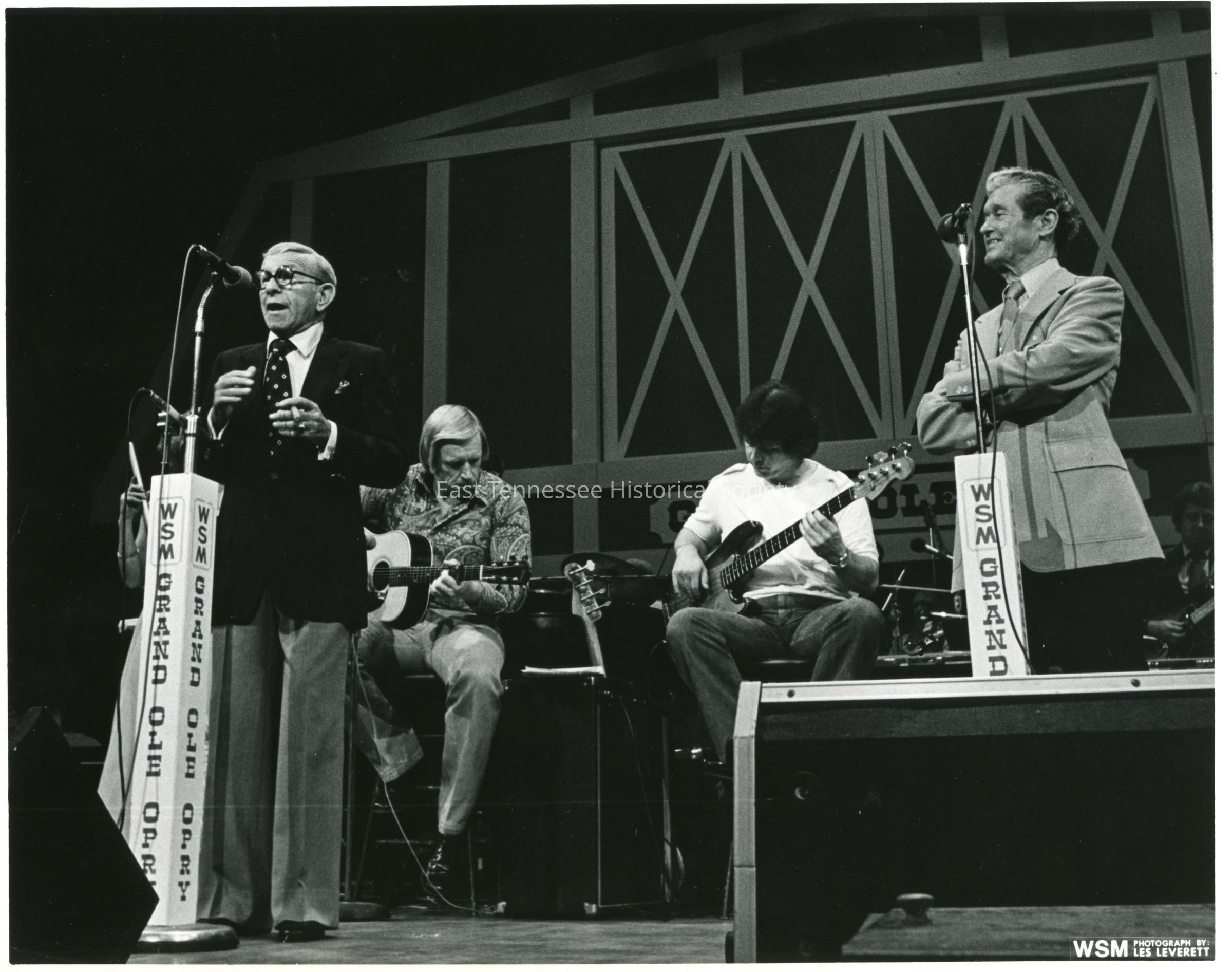 B&W photograph, left to right: (comedian/actor) George Burns, Roy Acuff, and unidentified musicians in background on stage at the Grand Old Opry, bottom right corner marked "WSM/ PHOTOGRAPH BY/ LES LEVERETT," reverse stamped "SEP 13 1980/ WSM PHOTO/ by Les Leverett, 7" x 10", 9/13/1980.Dimensions