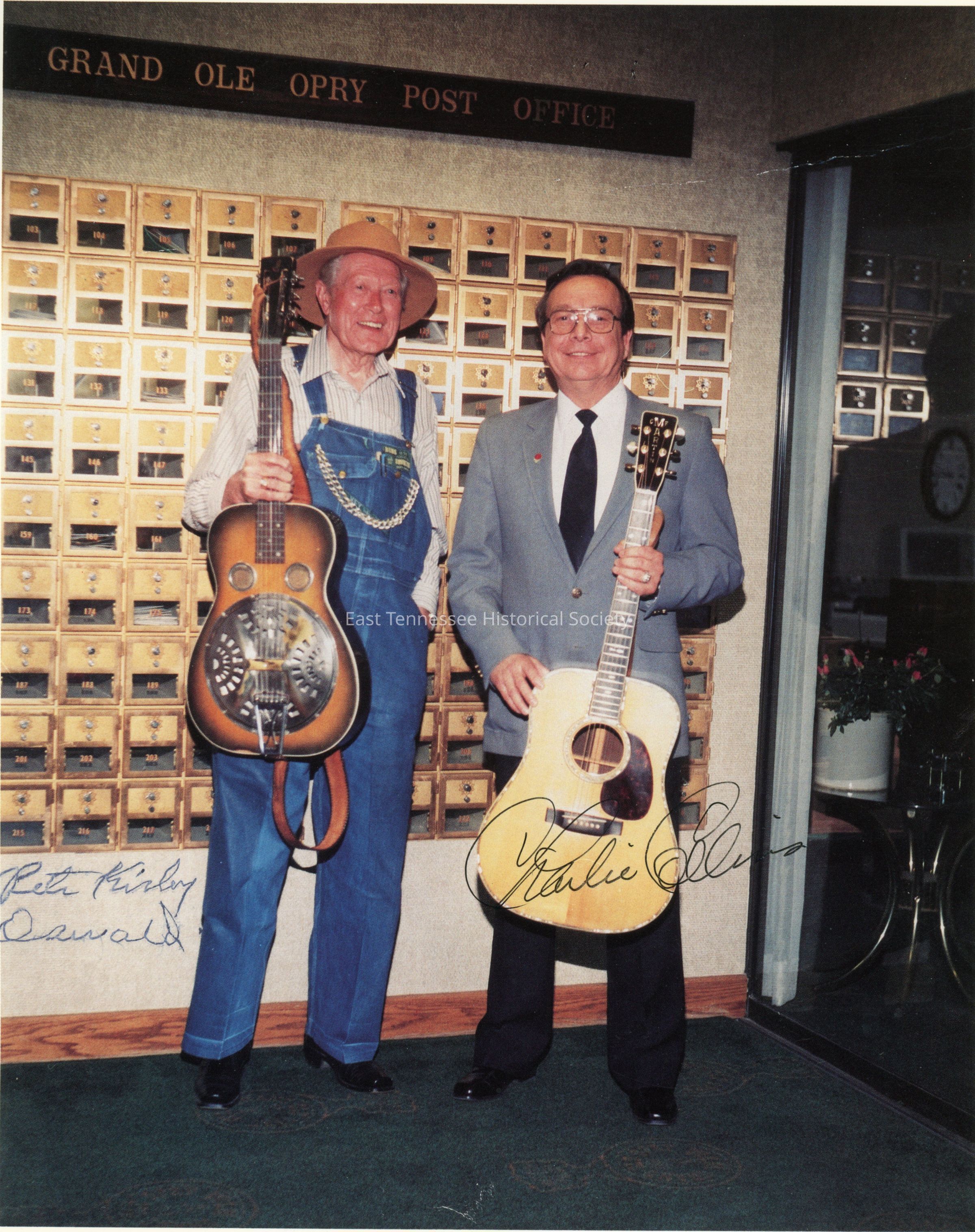 Color photograph, left to right: Pete Kirby (Brother Oswald) and Charlie Collins hold their instruments in front of mailboxes at the Grand Ole Opry Post Office, front signed "Pete Kirby/ Oswald" and "Charlie Collins," 7" x 10", undated.Made/Created