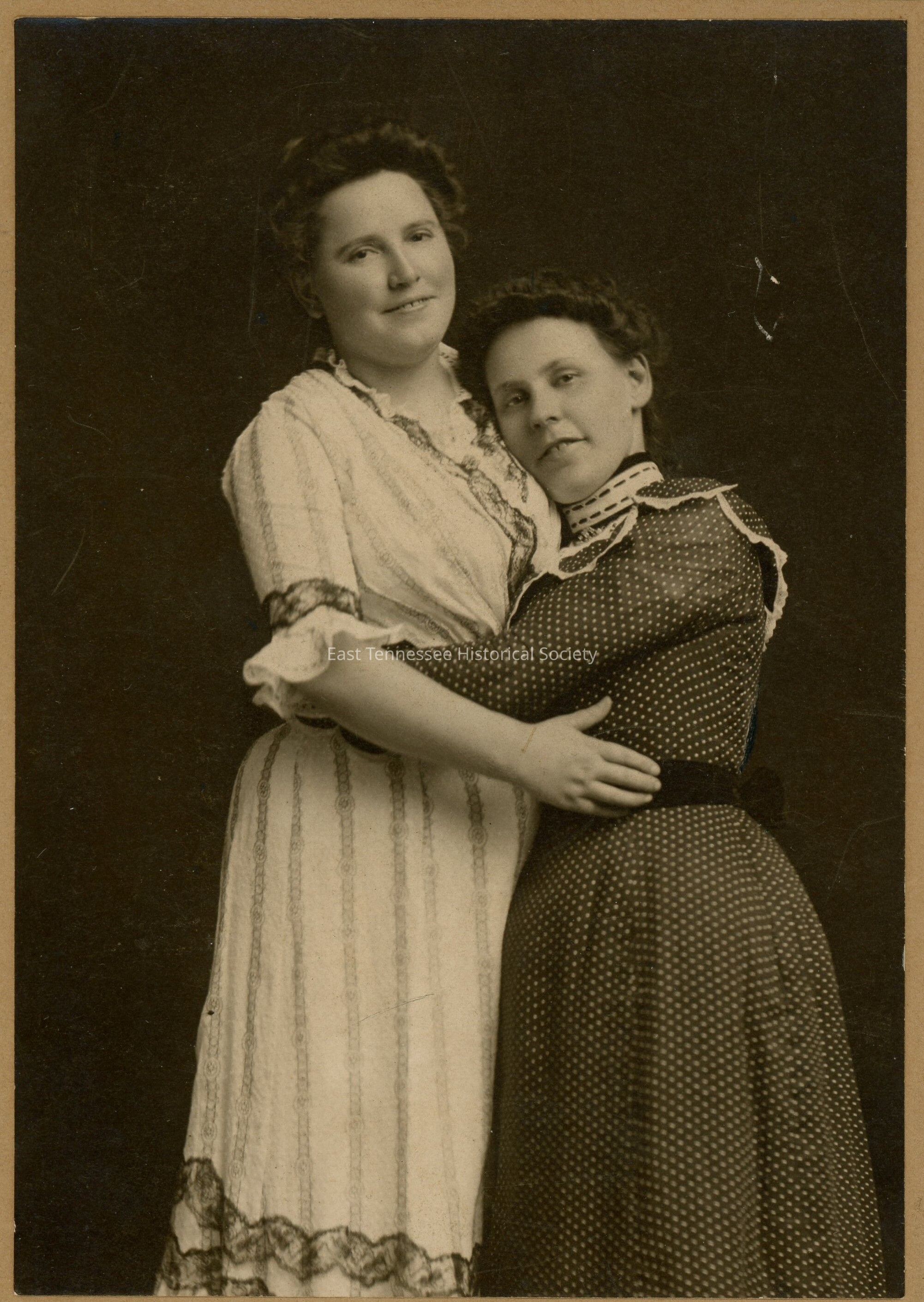 Photograph of Annie Cate [on right] with sister Nora, sepia, two women wearing Victorian clothing (Annie wearing polka-dot dress)/hair styles posed with arms around each other's waist, solid black background, front center bottom marked "BRAKEBILL & McCOY / KNOXVILLE, / TENNESSEE.," 7"h x 5"w, c. 1890s.Made/Created