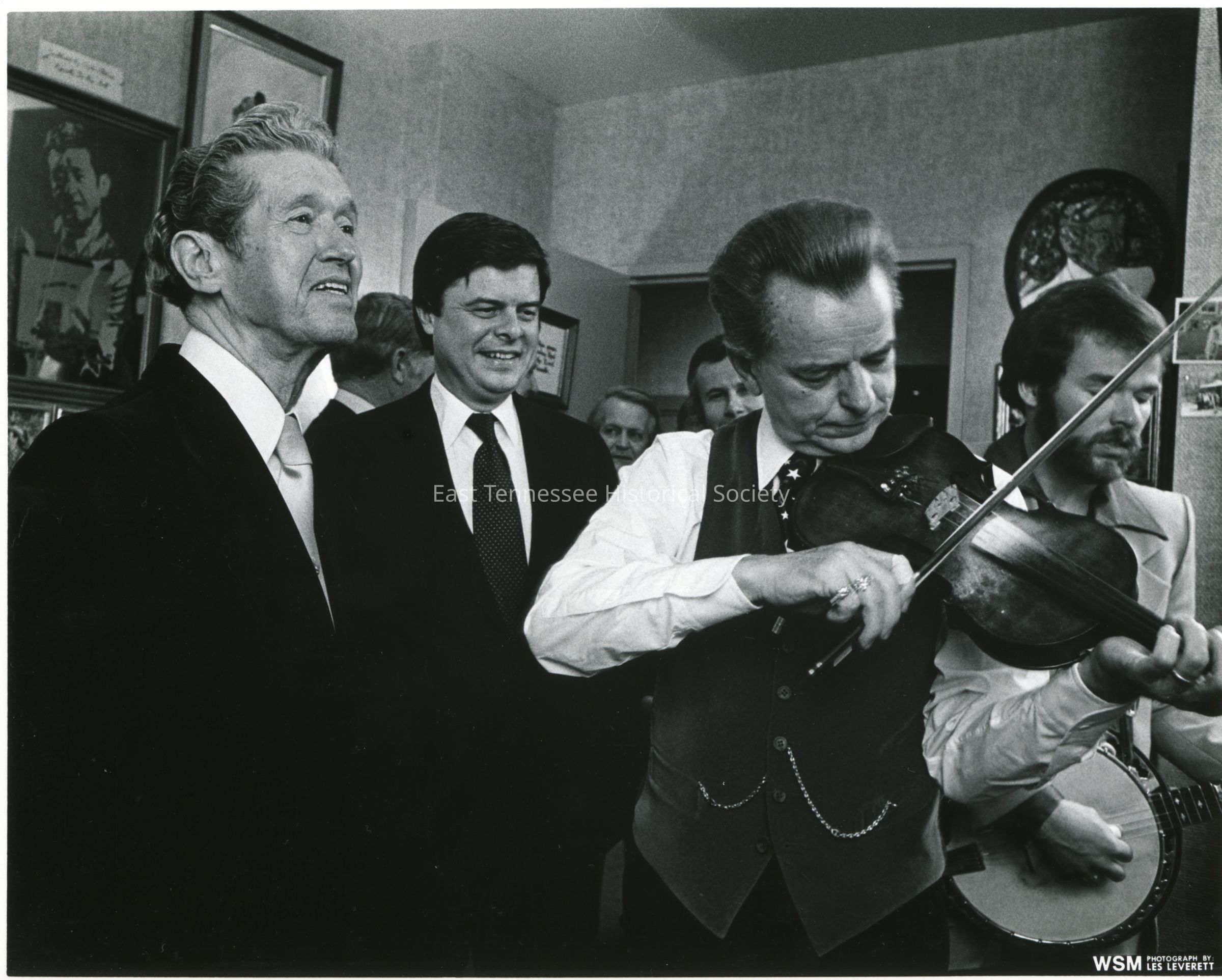 B&W photograph, left to right: Roy Acuff, (Tennessee senator) Jim Sasser, (West Virginia senator) Robert Byrd bowing fiddle, and other unidentified people in background, bottom front right corner marked "WSM/ PHOTOGRAPH BY/ LES LEVERETT, reverse stamped "MAR 3 1979/ WSM PHOTO/ by Les Leverett, 7" x 10", 3/3/1979.
