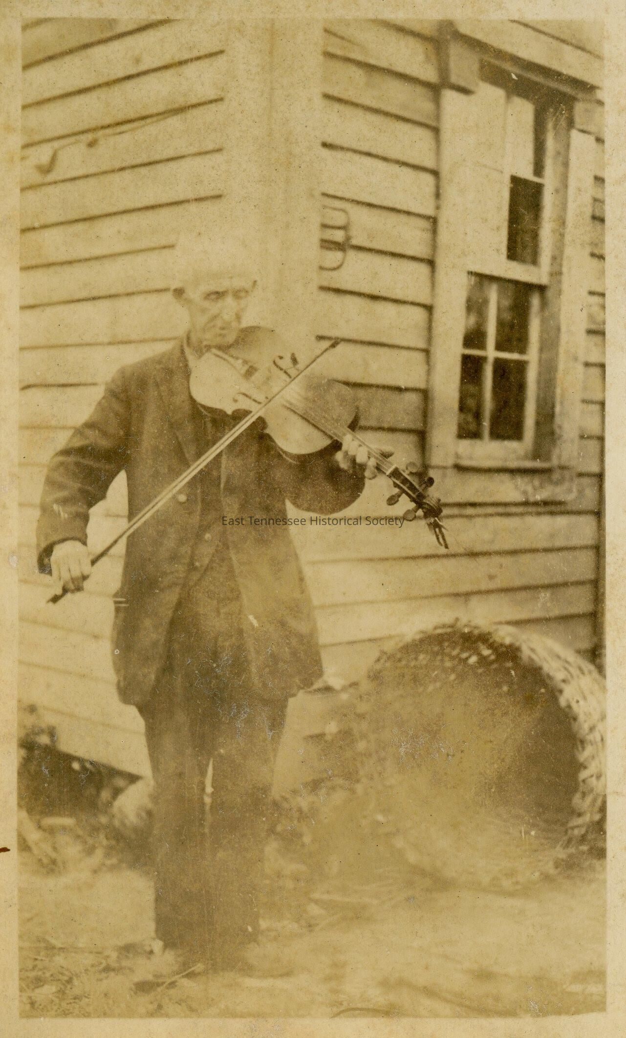 Black-and-white photo of man playing fiddle, inscribed "John W. Harris, Columbia, Tenn. [Maury County] 10/9/22.", 5.375"h x 3.25"w, Oct. 9, 1922.Dimensions