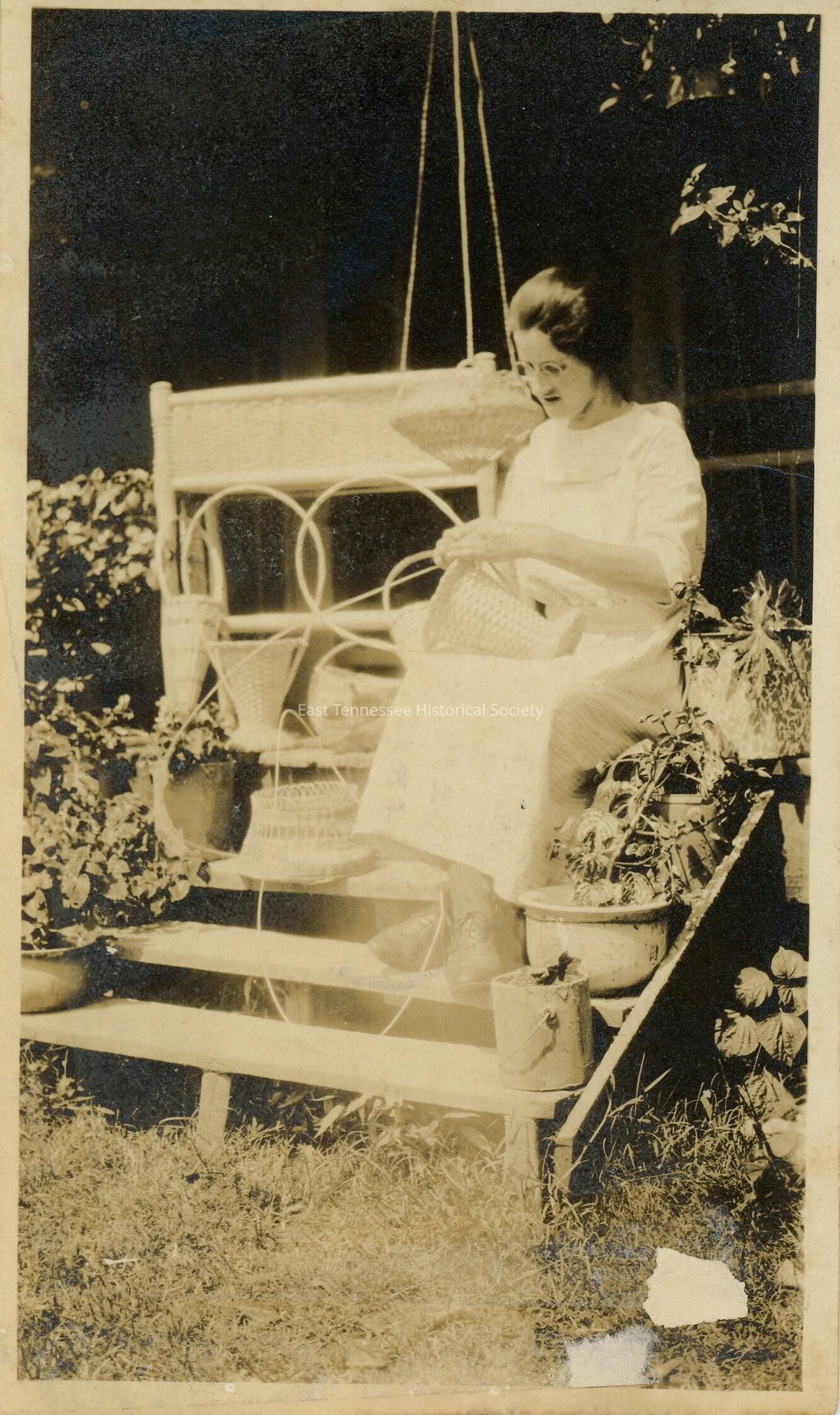 Black-and-white photo of lady basket weaving, "Woman Weaving Baskets," Daylight, Tenn. (Warren County), date unknown.