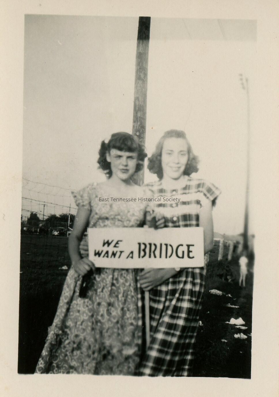 Black-and-white photograph of protest rally at Fort Loudon Dam, 3 1/2"h x 2 1/2"w, late 1940s.