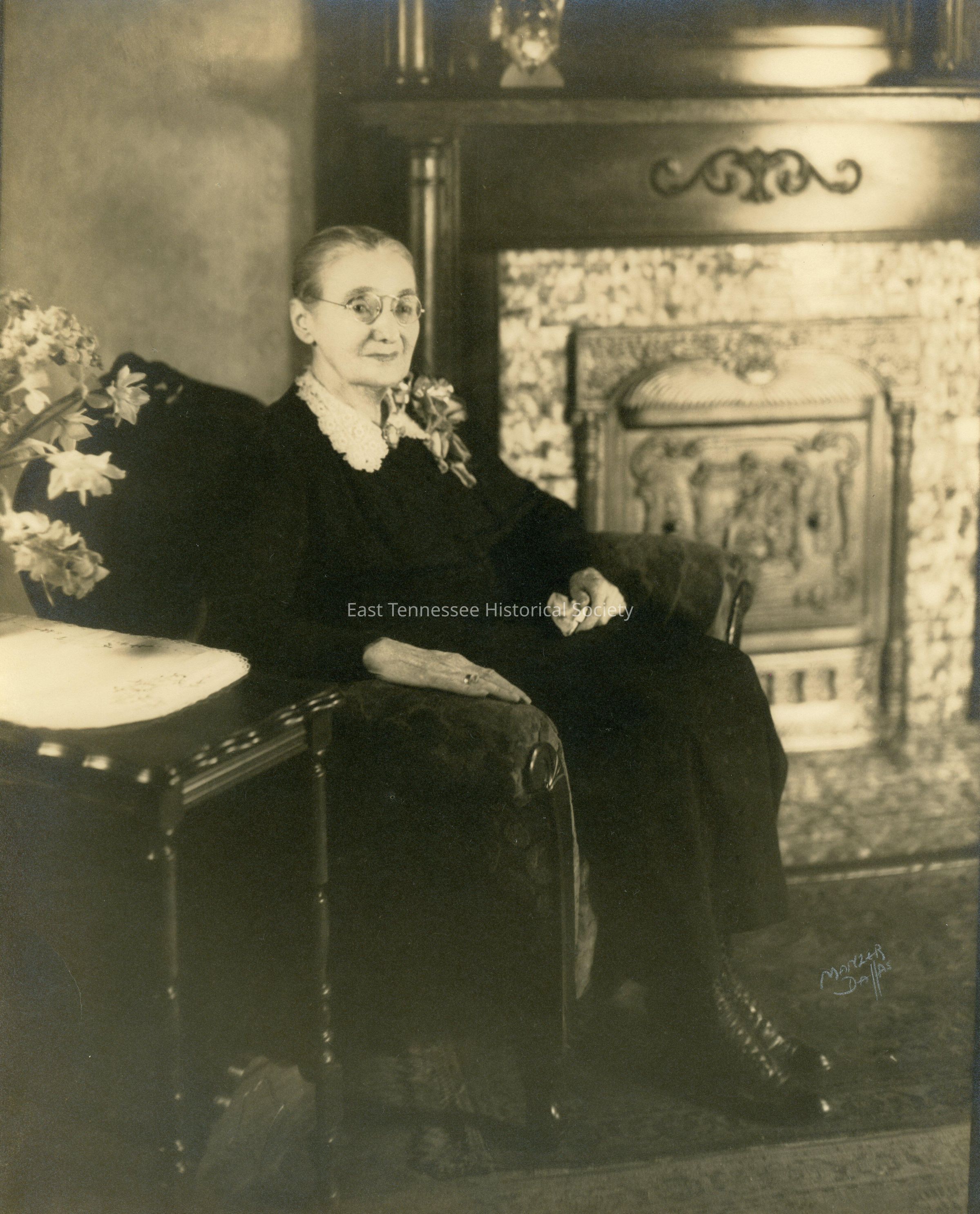 Sepia photo of Florence Day McKamey (wearing corsage and seated in plush chair with mantle behind), lower right corner marked "MANLER/ DALLAS."