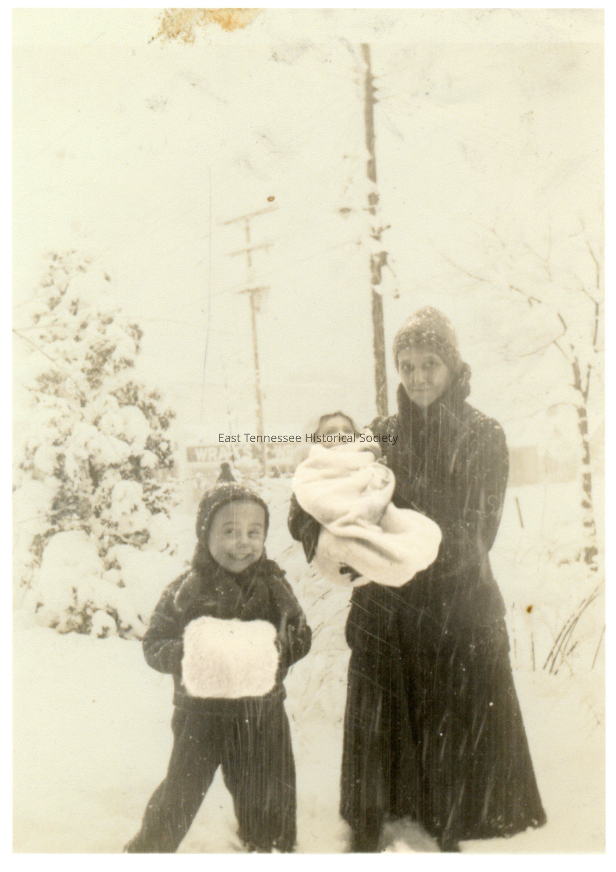 Copy print of Beatrice Wade Wray and granddaughters Gail (left) and Judy (being held) Wray, paper 11"h x 8 1/2"w, image 5 1/2"h x 4"w, 1939. The picture appears to be taken on Mrs. Wray's Washington Avenue property; the sign of her son Hubert's store, Wray's [Shopping Center], can be seen in the background.