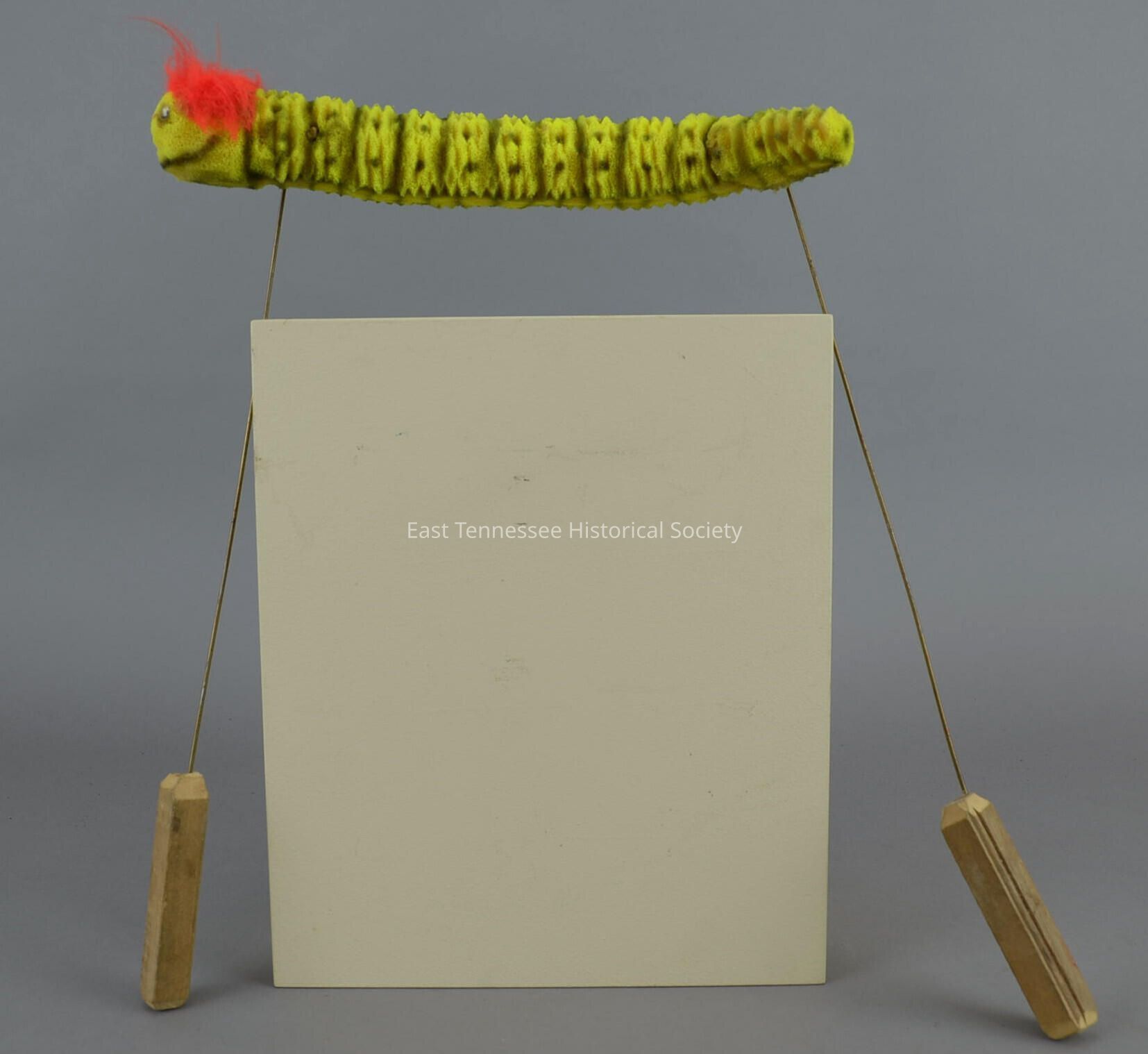 Puppet prop from Archie Campbell's Hee Haw Show (Gatlinburg), yellow and green-painted form-rubber caterpillar with black stripes and spots, plastic eyes and red hair, pair of long thin metal rods stuck into body from below with wood handles at other end (to guide movement), 16"h x 14"w x 2"d, date unknown/1960s-1970s.Collection