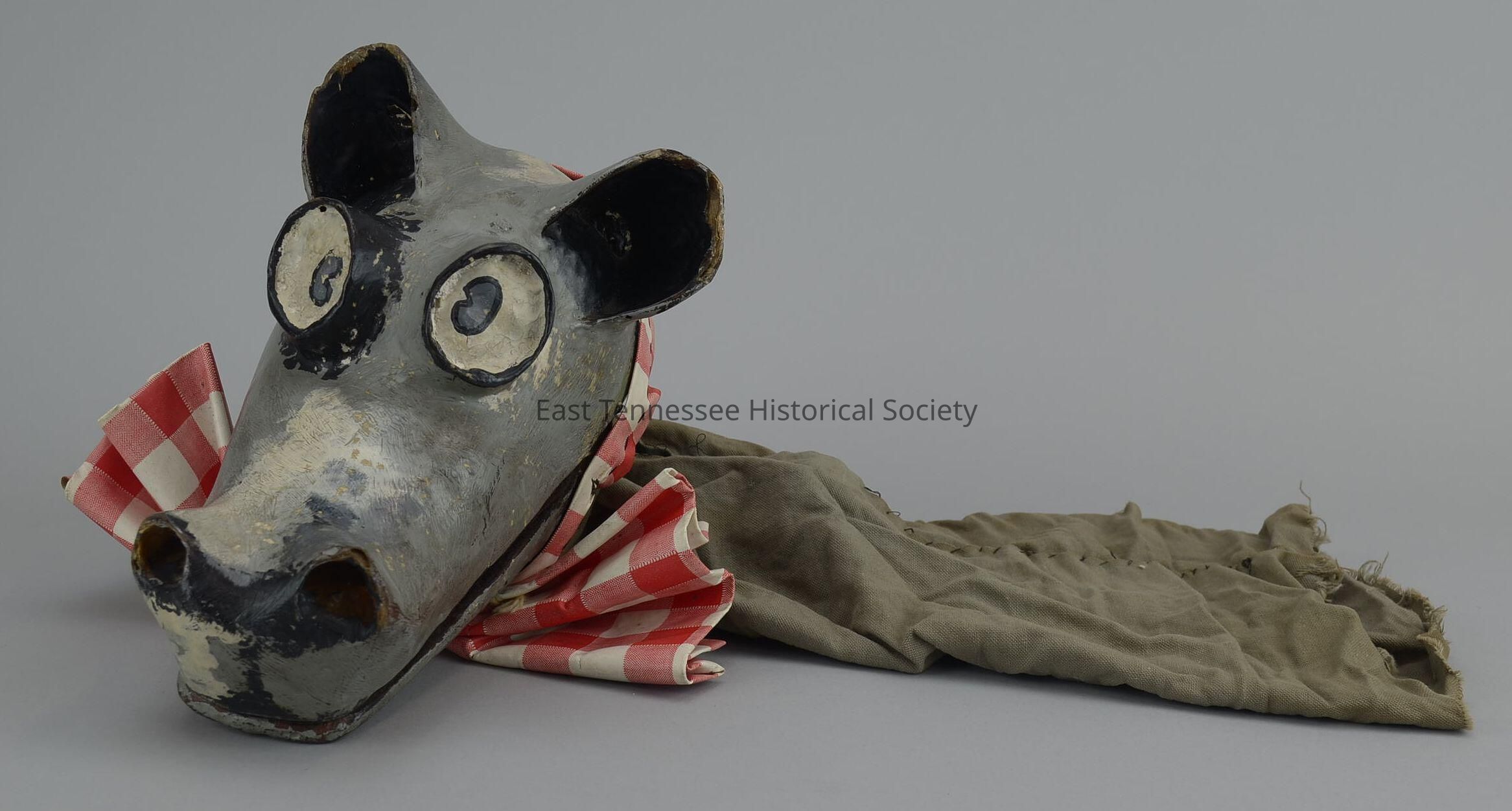 Hand puppet known as "Birthday Dog," 6"w x 10"d gray-painted papier-mache head with white-and-black features/protruding eyes/long nose/black felt-lined mouth/hinged jaw/large ears, gray-cloth sleeve for neck with attached red-and-white check oilcloth bowtie, believed made by a WBIR crew member, 24"h x 9 1/2"w, 1956.