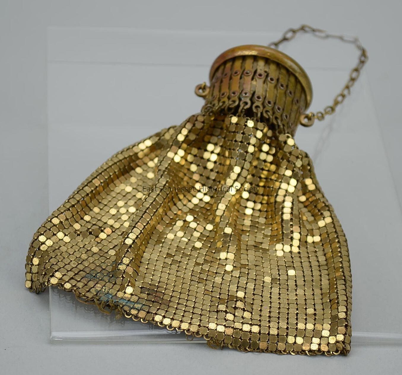 Evening bag/purse of Frances Lewis Hurley, gold-tone metal, gold-tone hinged top with heart design, expandable to 4" diam. when top up, gold-tone chain handle fastened on each side, 8 1/2" x 5"w, c. 1930s.Made/Created