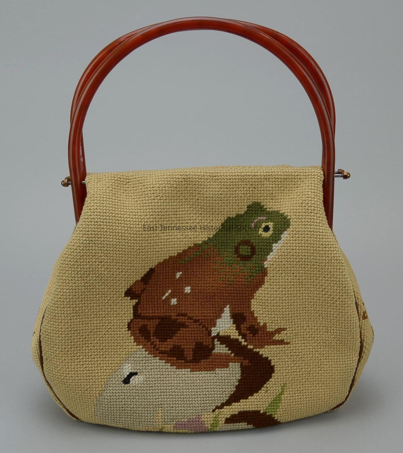 Pocketbook off Janet Welton Postler, needlepoint, brown-and-green frog design on a beige/dark brown mushroom with fly on front, monogram "JWP" on reverse in brown framed in green/brown, green/brown diamond-shape design on sides and bottom, two rounded plastic non-matching handles with hinge, gold lining with two zipper pockets/two open pockets, made by Eugenia Howard (per interior label), 16"h x 10"w x 2 1/2"d (sides extended)/5 1/2"d top side, dated 1976.