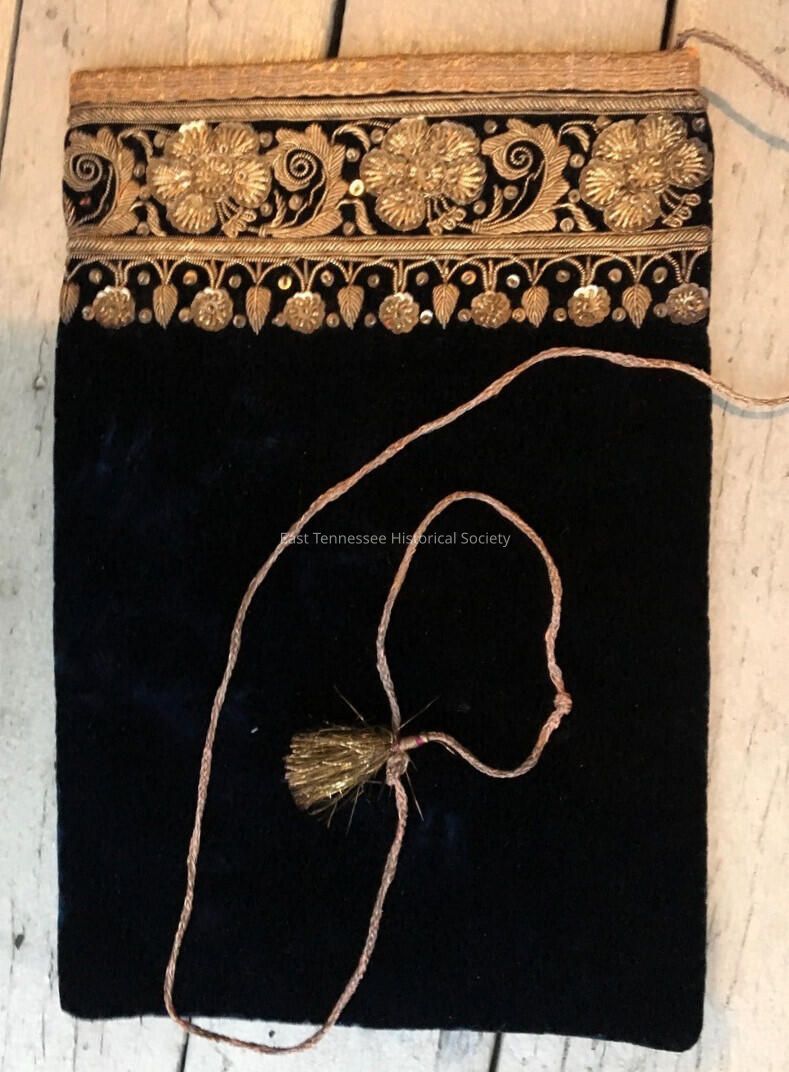Evening bag, handmade, dark-blue velvet cloth, gold beadwork shaped into five petals/flowers/leaves at top 2 ½", long tassel attached to one seam, crushed purple interior, c 1920s?