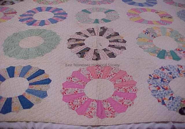 Quilt made by Florence Day McKamey, "Dresden Plate" (aka China Plate) pattern. Cotton prints typical of 1930s-1940s (perhaps more likely in '40s). Some plates may be from feedsack cloth. White background with multicolor segments in blue, pink, green, yellow and black. No decorative border or edging. Backing is white. Pieced and appliqued. Hand quilted; quilting outlines segments and forms a diamond pattern on backing of quilt.